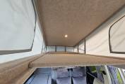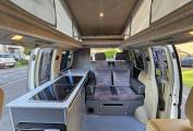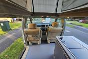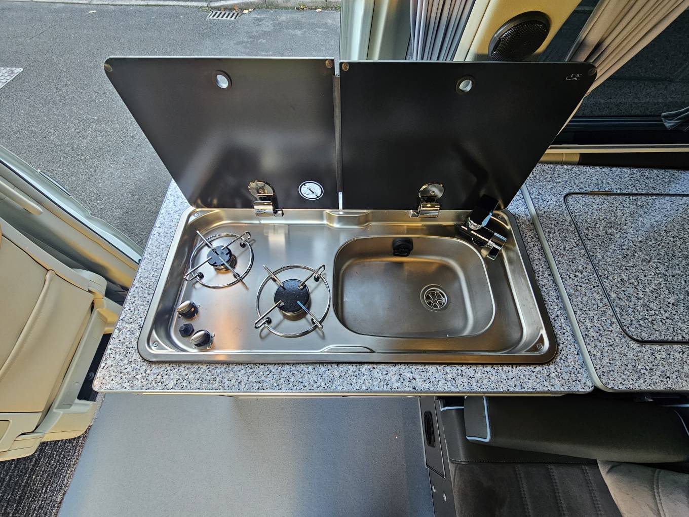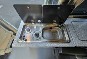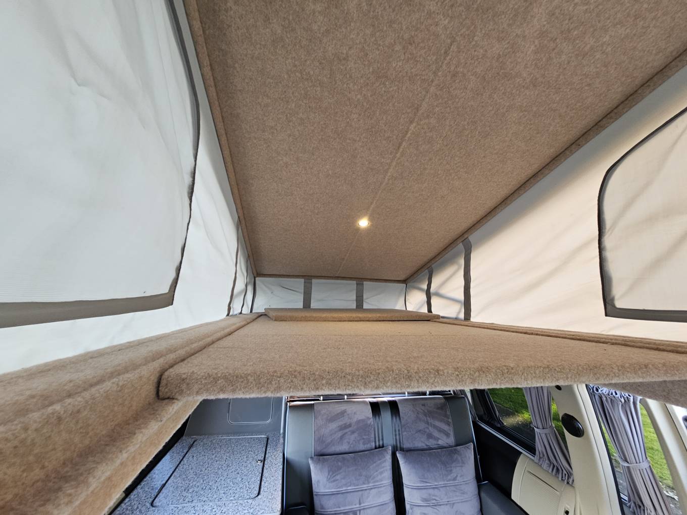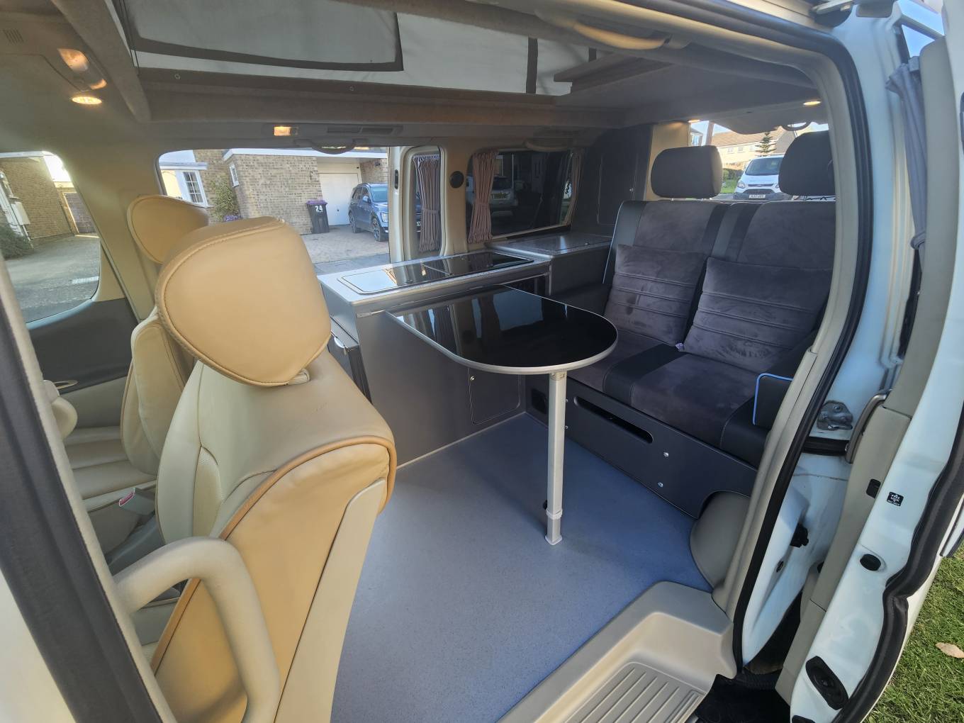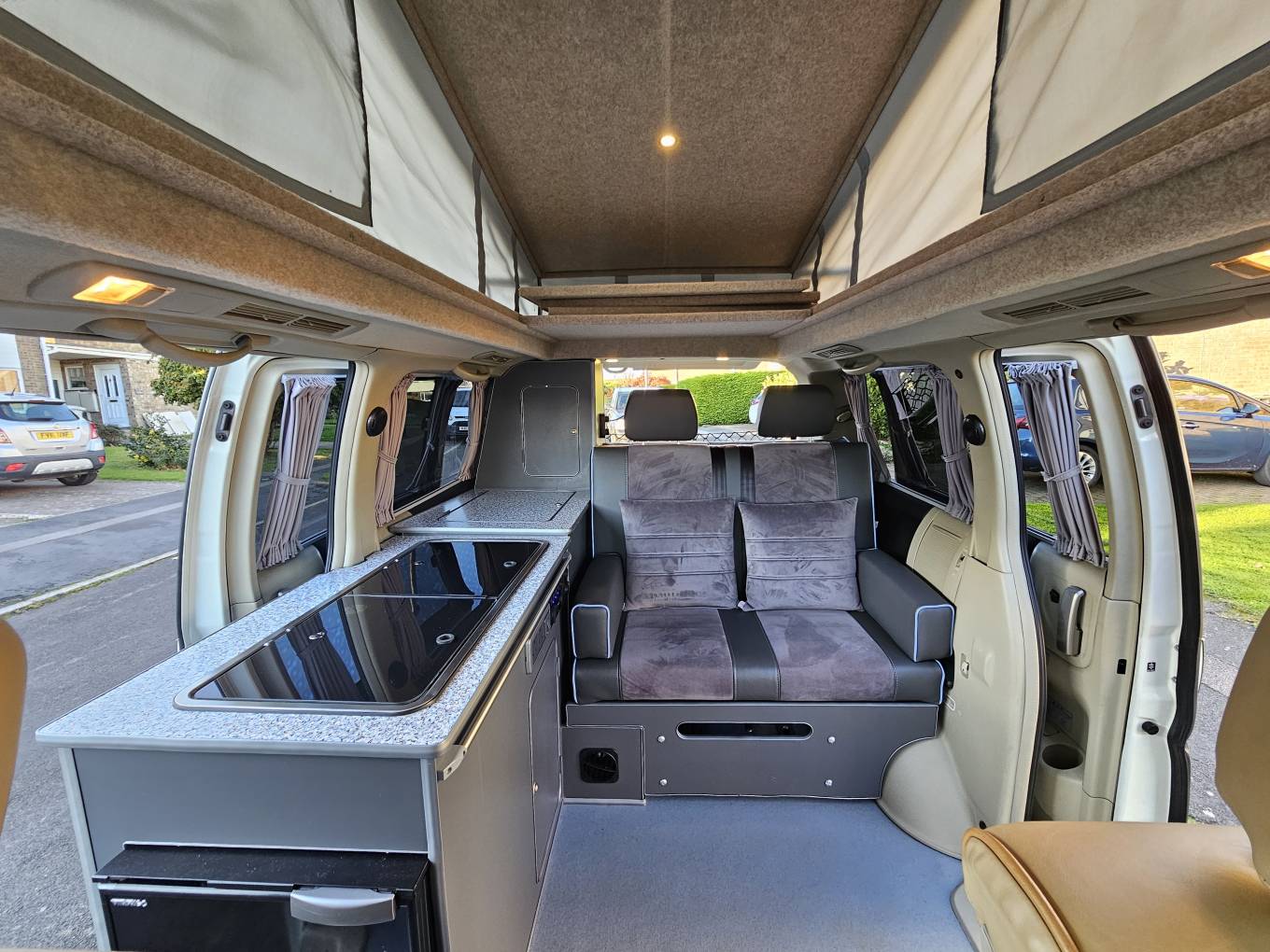 Power and energy needs are met with a Renogy 100W solar panel, a Victron charger, and a VSR charging kit, complemented by a AGM leisure battery fitted in 2023. It also comes with habitation air conditioning, and a Propex HS2000 gas heater. The campervan is fitted with a Gaslow LPG refillable system, which carries a 1 x 6kg bottle, Cooking and storage are handled by a Dometic 2-ring gas hob and a fridge with a small freezer compartment. Entertainment options include a new Pioneer double DAB radio and a roof-mounted Sargent flat-screen TV and DVD player.