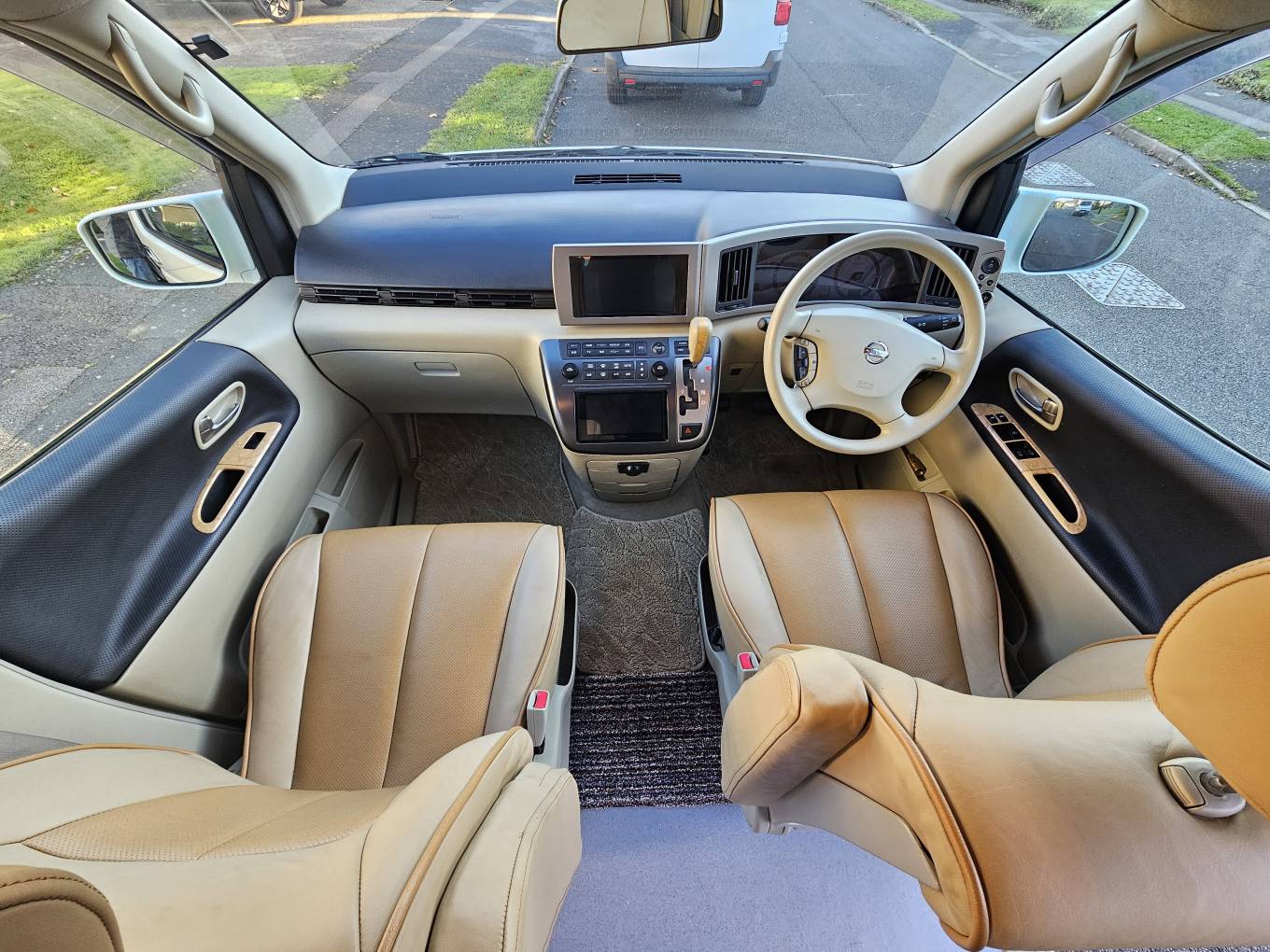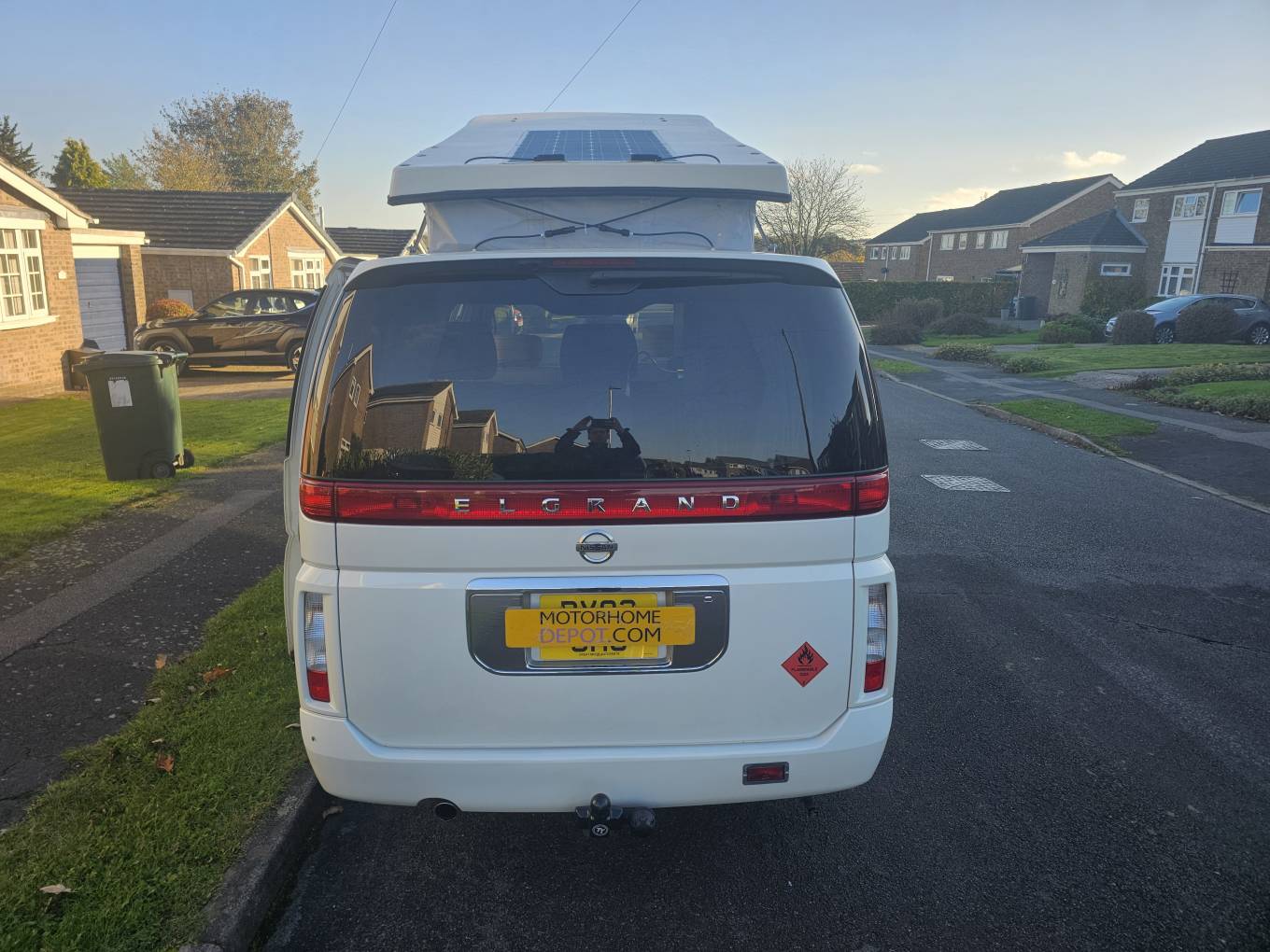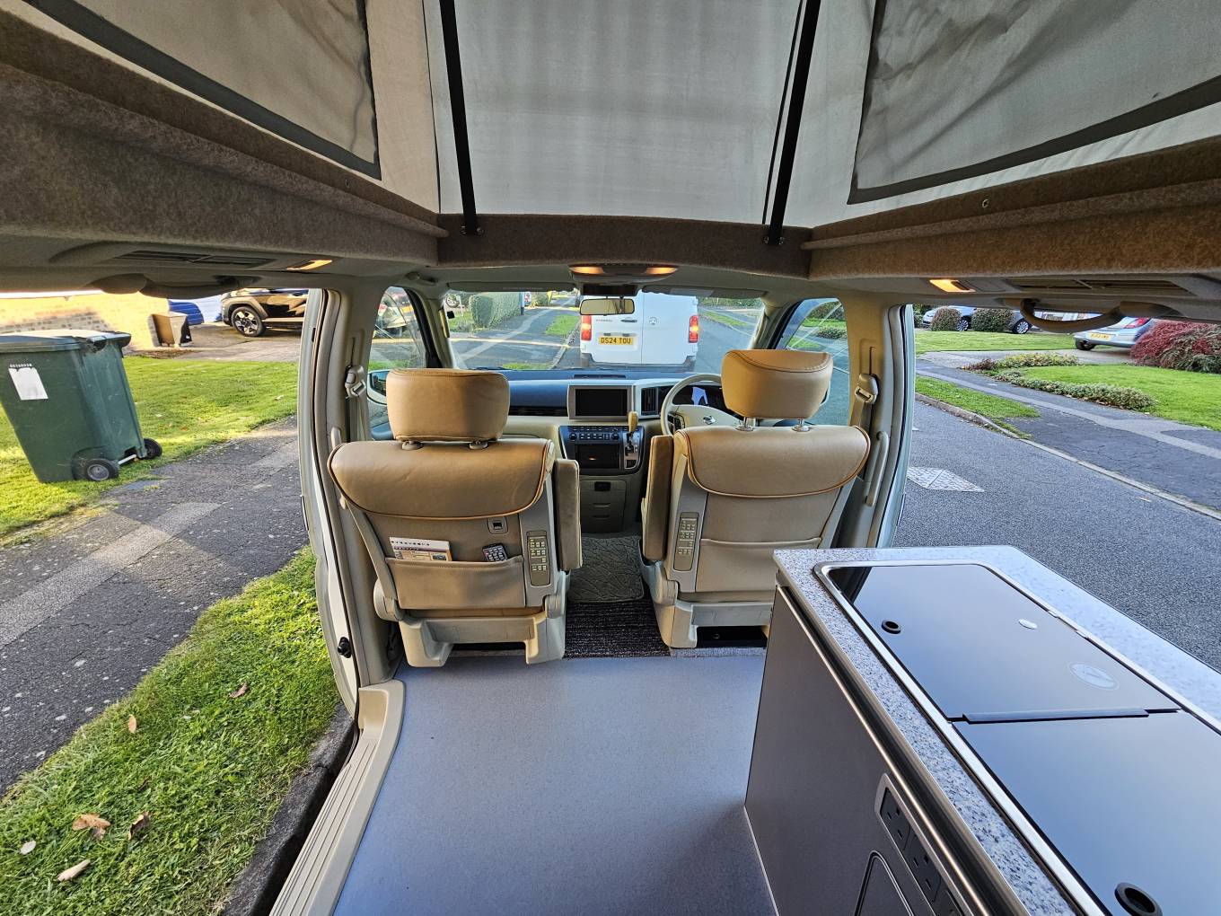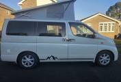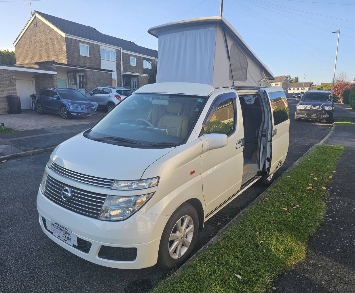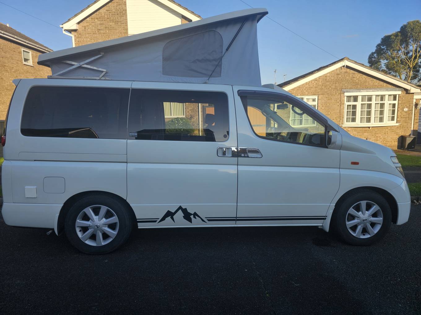 2002 Nissan Elgrand campervan, this tidy campervan boasts just 53k miles and is right-hand drive, featuring an automatic gearbox, a 3.5L bi-fuel LPG/Petrol engine, and weighs 2650 kg. First registered on 14/05/2002, MOT valid until 28/09/25. The conversion was completed in 2023 and has been fitted with everything you need for a perfect family adventure.The vehicle has 4WD system with a RWD option, drive Lodge pop-top with bed boards, 2 x captain swivel seats, and a custom side kitchen designed by North Star Campers.