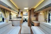 The massive lounge is situated to the rear of the motorhome and has sofas in a u shape with a large sunroof and windows all around which floods the area with natural light. There is an TV point on the offside with a built in digital aerial. The table neatly folds away into a front cupboard for travelling.