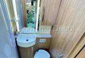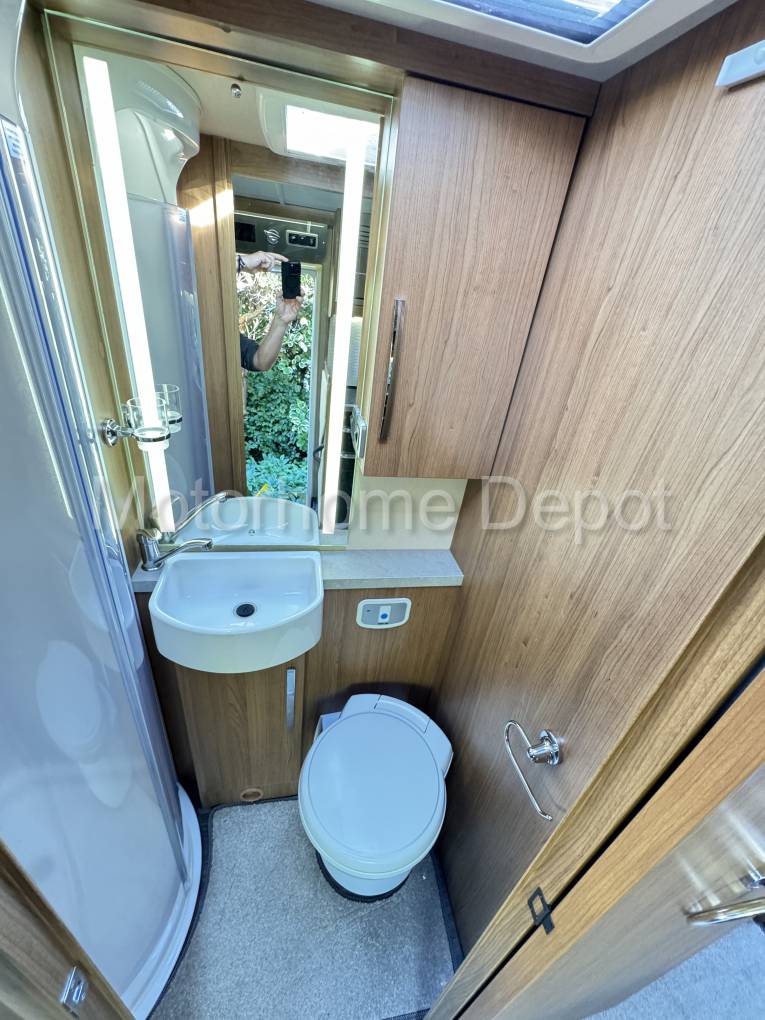 A large bathroom is located immediately opposite the Habitation door, which consists of a built-in washbasin with chrome mixer tap, a Thetford cassette swivelling toilet with fresh water flush, plus a good sized separate shower cubicle with folding Perspex doors to enclose. Opposite is a large hanging wardrobe.