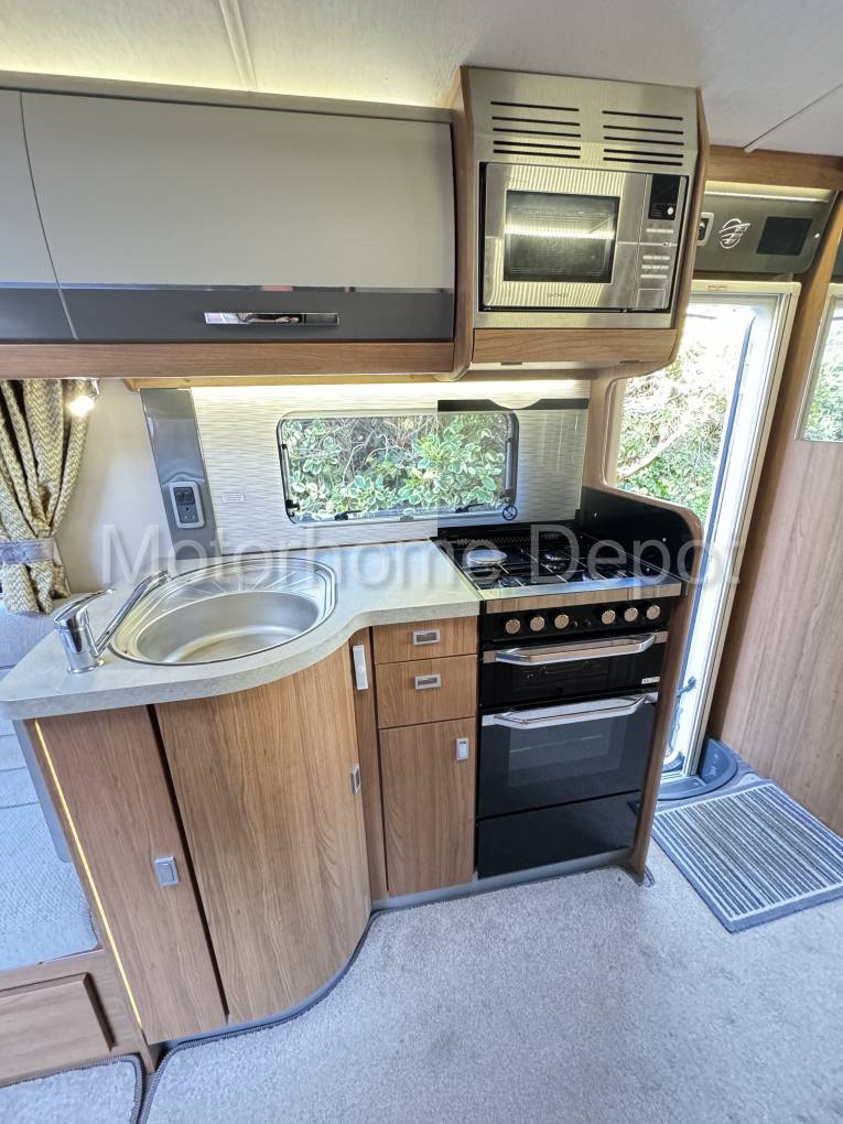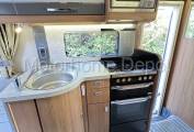 We enter the motorhome via an electric step with the kitchen immediately on your right, it consists of a dual fuel hob that has three gas burners and an electric hotplate that will use the electric when plugged into the mains at the camp site, an oval sink & drainer in a matt finish that has a chrome mixer tap, a full gas oven and grill plus there is a microwave built-in above. There is ample drawer & cupboard space for all your kitchen utensils. Opposite is a large slimline Thetford absorber fridge freezer that is fully automatic and can be powered by 240v; 12v or gas depending on whether you are on site or wild camping.
