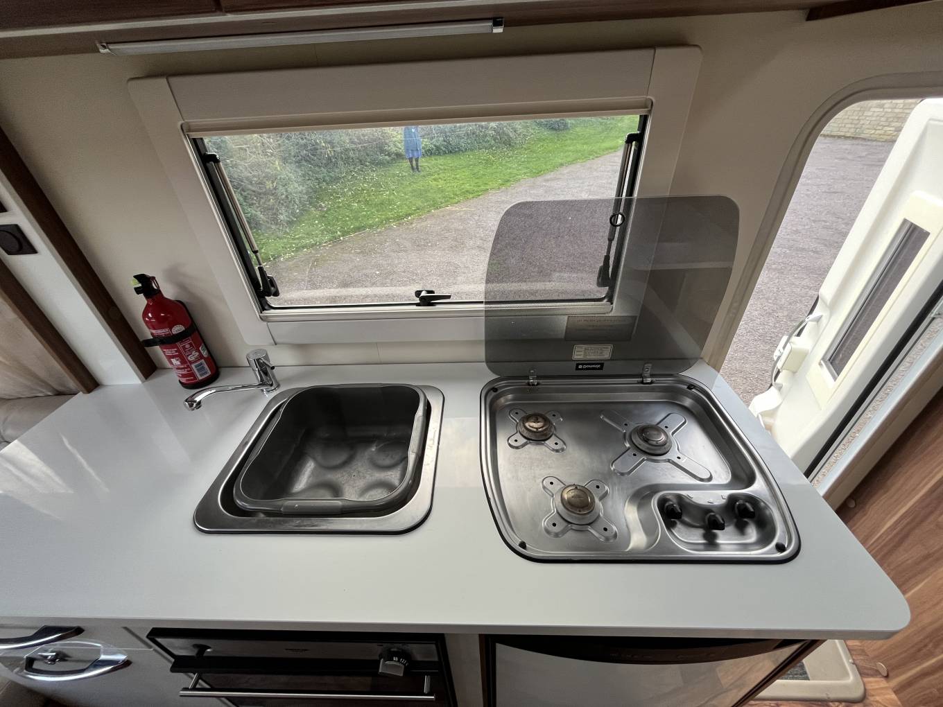 The kitchen is compact yet fully equipped, featuring a gas hob, oven, sink,