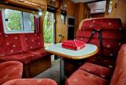 L shaped lounge complete with two forward facing seatbelts, with a small sofa opposite. Swivel Captains seats and folding table provide dining for up to six adults. Remis Blinds to the large cab windows. garage entry doors to both sides, cab door to the passenger side and habitation door on the driver's side.
