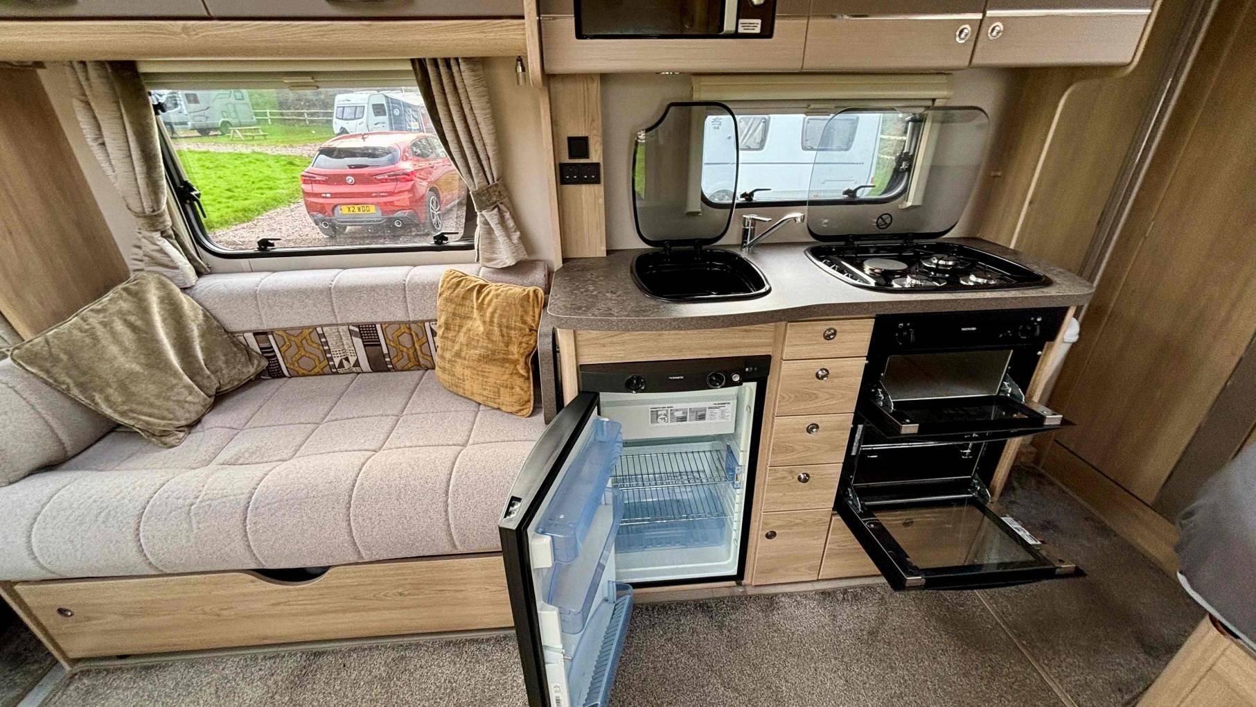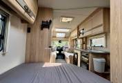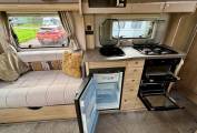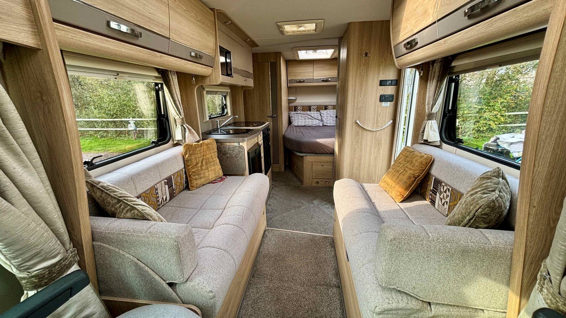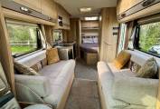 The lounge area is to the front and consists of two side-facing bench seats, which along with the 2 Captain seats and fold-away table also provide the ideal place to dine. The area also easily converts to the second double bed by pulling the sofas together.