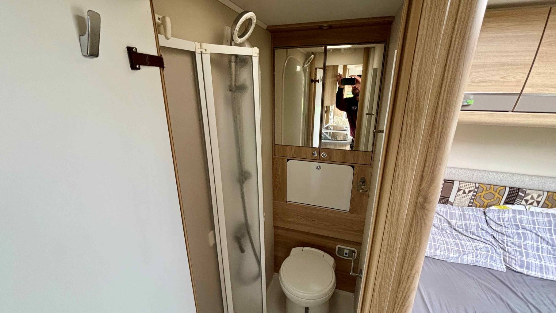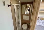 Adjacent to the bed you will find the washroom which comprises of an integrated shower, Thetford cassette toilet and drop-down hand washbasin with hot and cold water.