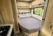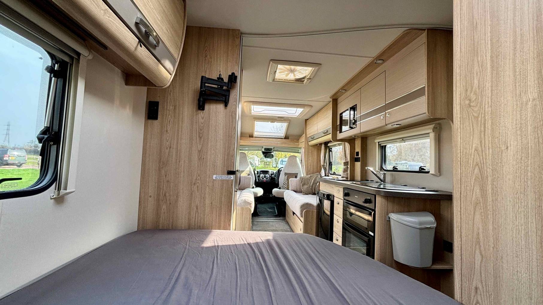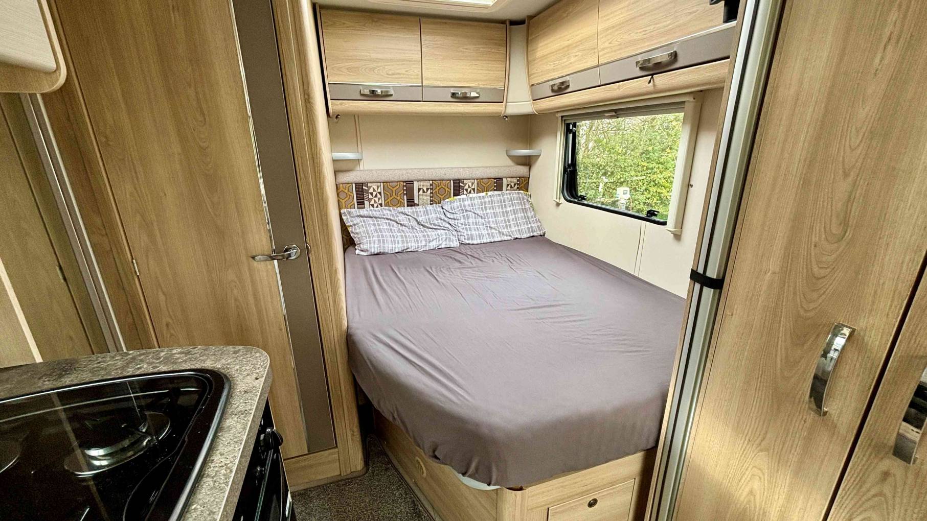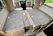 To the rear of the motorhome is the fixed French bed with generous storage underneath which can also be accessed from an external locker. There is additional overhead locker storage, and you will also find an aerial point and TV.