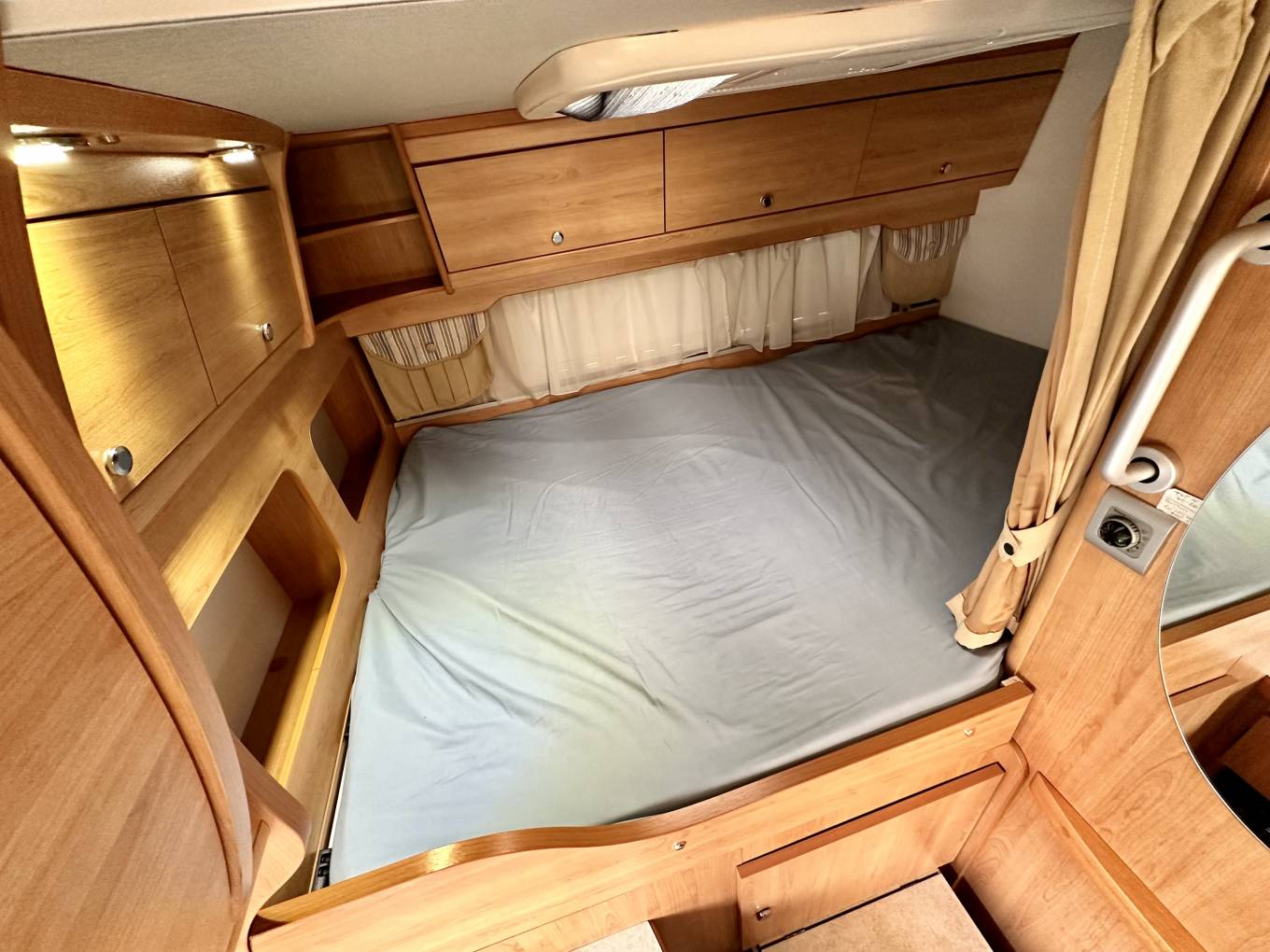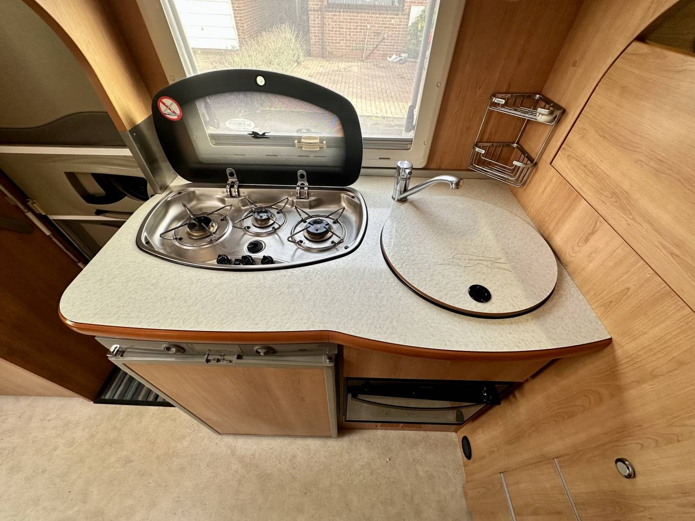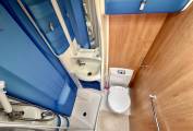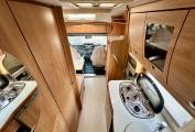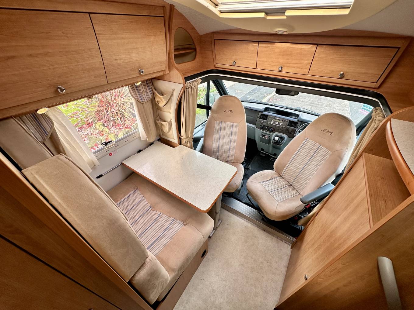 At the rear of the motorhome, you will find the fixed transverse double bed with large garage under accessible externally for storage of large items such as bikes and barbecue tables and under bed compartmental storage is accessible from the inside also. Moving forward you will find the practical washroom including a cassette toilet, a wash basin with mixer tap, vanity storage with large mirror and a folding wall which conceals the washbasin and creates a waterproof free-standing shower unit. Adjacent to this you will find the well equipped kitchen area including an oven and grill, 3 burner hob, fridge with freezer compartment, a sink with mixer tap and plenty of storage. In the heart of the motorhome you will find the light and airy dinette area which comfortably seats up to 4 people utilising the front two swivel captain seats. As the night draws in, this effortlessly converts in to a comfortable single bed. There is ample storage throughout the Motorhome including a generous garage. A large skylight is situated over the cab, flooding the habitation with plenty of natural daylight.