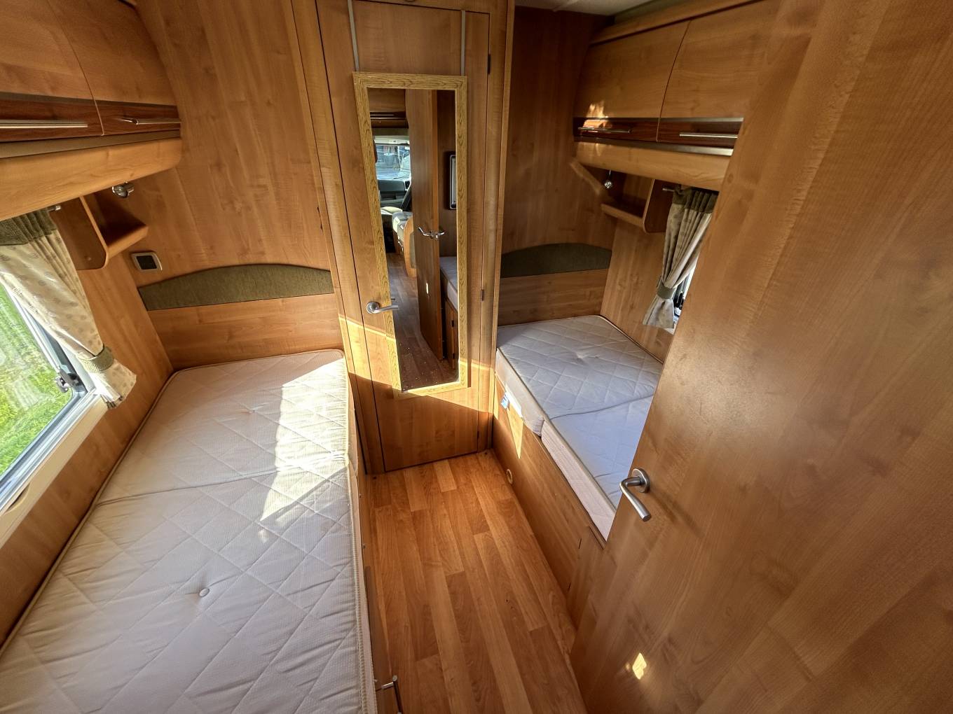 Layout - At the rear you have the well sized full washroom with the desired separate shower cubicle and also the large wardrobe space and this is one that will help ensure nothing is left behind and you will notice there is so much storage space with this Cheyenne. You then have 2 single beds in a room that can be shut off from the washroom and the living area and again offers you plenty of storage space underneath and around the bed and a space for a TV with the bracket ready.