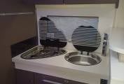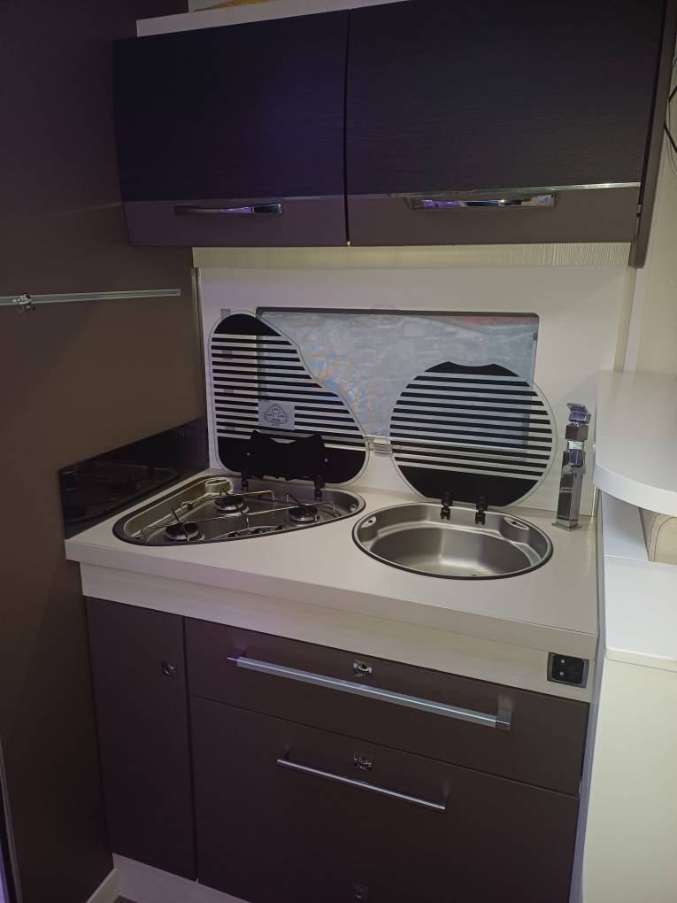 metal sink with chrome mixer tap and a 3-gas burner hob, on the opposite side