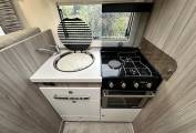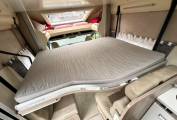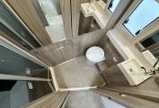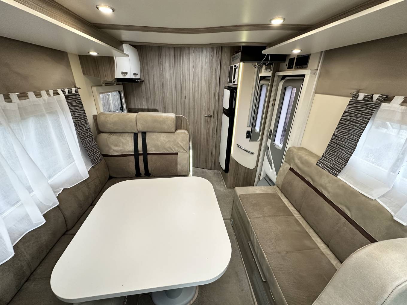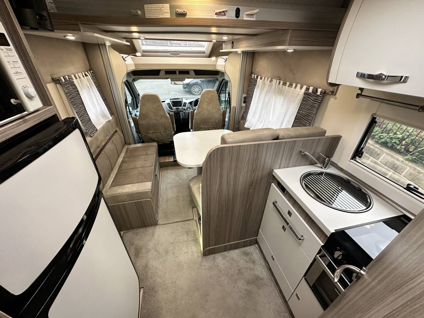 Starting at the rear of this well designed motorhome you will find the spacious washroom including a wash basin, Thetford cassette toilet, separate shower cubicle and storage. Moving forward is the fully equipped kitchen complete with a 2 ring gas hob and electric hot plate, oven, grill, sink with mixer tap, microwave, a generous sized fridge/freezer and ample storage. In the heart of the motorhome is where you will find the spacious dinette area which comfortably seats up to 6 people by utilising the front two swivel seats. This area is flooded with natural light thanks to the skylight and is the perfect place to relax and unwind while watching TV. As evening nears it converts into a comfortable double bed. Above this area is a practical drop down bed completing this 4 berth motorhome.