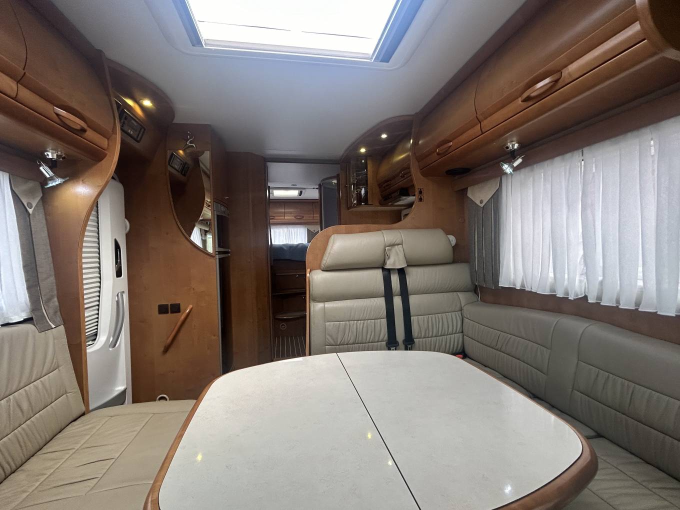 Sleep in ultimate comfort on the large drop-down double bed in the front, or retreat to the fixed transverse bed in the private rear bedroom, complete with its own TV on a sturdy wall bracket. Enjoy relaxed dining with an adjustable table surrounded by comfortable seating, plus extra forward-facing seats with belts. Light floods in from a generous skylight, highlighting every detail of the dining and kitchen areas. This kitchen is a chef’s delight, fully equipped with an oven, grill, gas hob, and 3-way fridge freezer, plus a clever sliding TV bracket for entertainment.