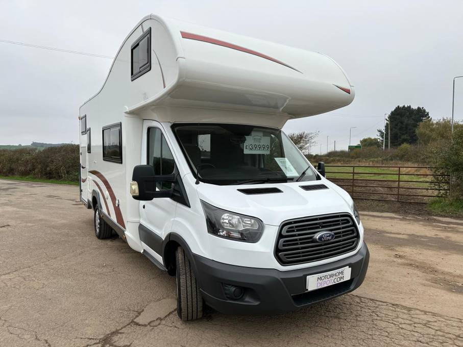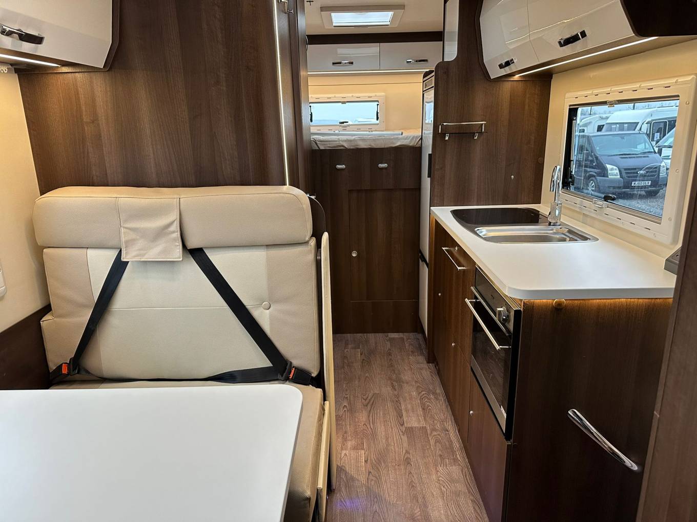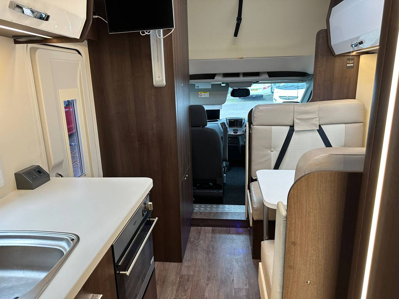Motorhome Depot Retail near Farnsfield present this well cared for Roller Team Zafiro 690 2018 model. At the heart is the reliable Ford 2.0l auto vehicle running on diesel and under the total 3500kg required for a normal car license. This 6 berth, 6 seatbelt vehicle provides luxury and space which is just perfect for family travel and life. Sleeping accommodation is in a large over cab double with safety net, a double converted from the forward dinette and a large rear transverse fixed double situated over the large garage space at the rear. The washroom has a toilet and sink with mixer taps, skylight and vanity units alongside a full height separate shower cubicle. The kitchen area in the middle of the vehicle has a 3 ring gas hob, large sink with mixer taps, expansive preparation area to the side of the hob, Thetford duplex oven incorporating grill, very large fridge including a freezer compartment and lots of lockers and low level cupboards. There is ample storage throughout the vehicle including a massive wardrobe, to the side of this is a wall mounted TV and bracket and there is beautiful LED lighting throughout. There is a roof mounted solar panel which keeps the leisure power topped up when off grid. On the outside the vehicle has a reversing camera. The garage is a particular feature of this motorhome with access via massive doors either side and enough space for several bikes and camping equipment. There is also a large awning to the side for shade or cover.