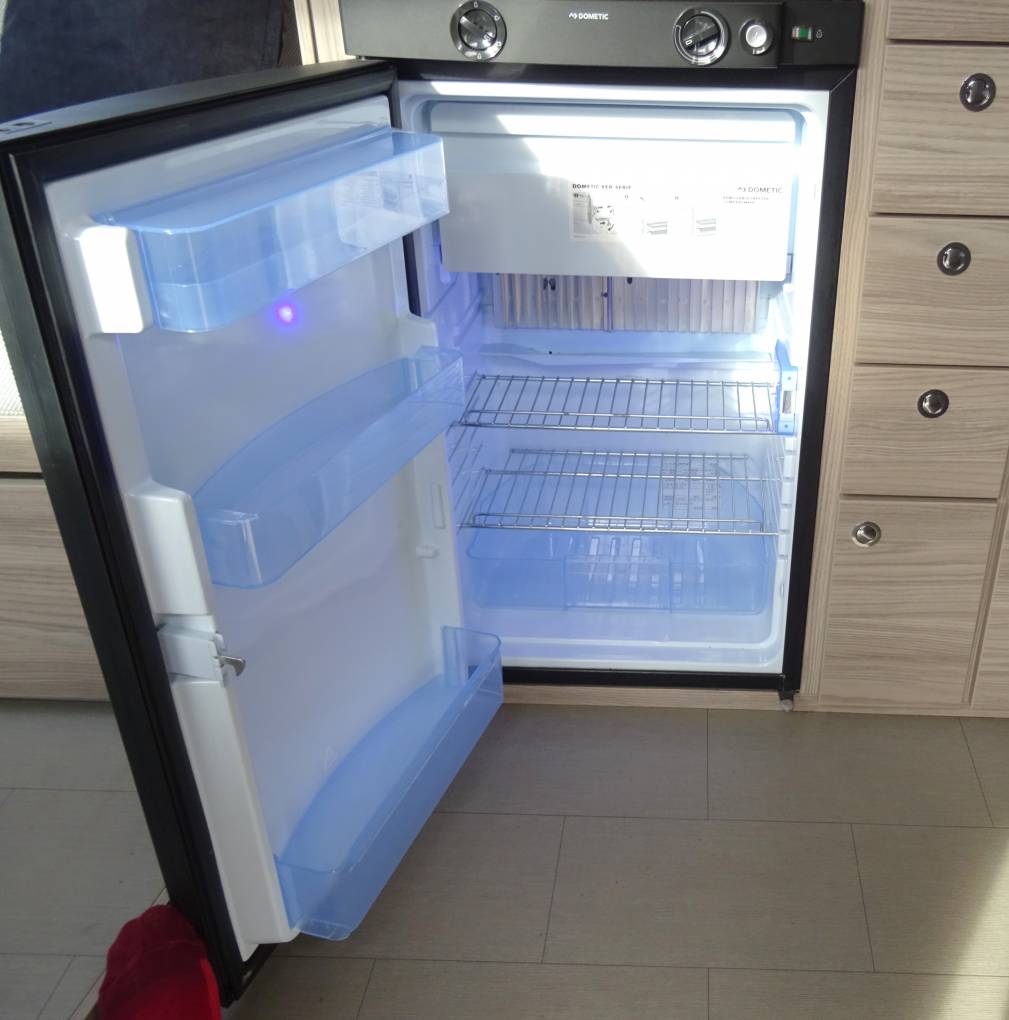 burner hob and electric hotplate. Below the worktop is a Dometic fridge with