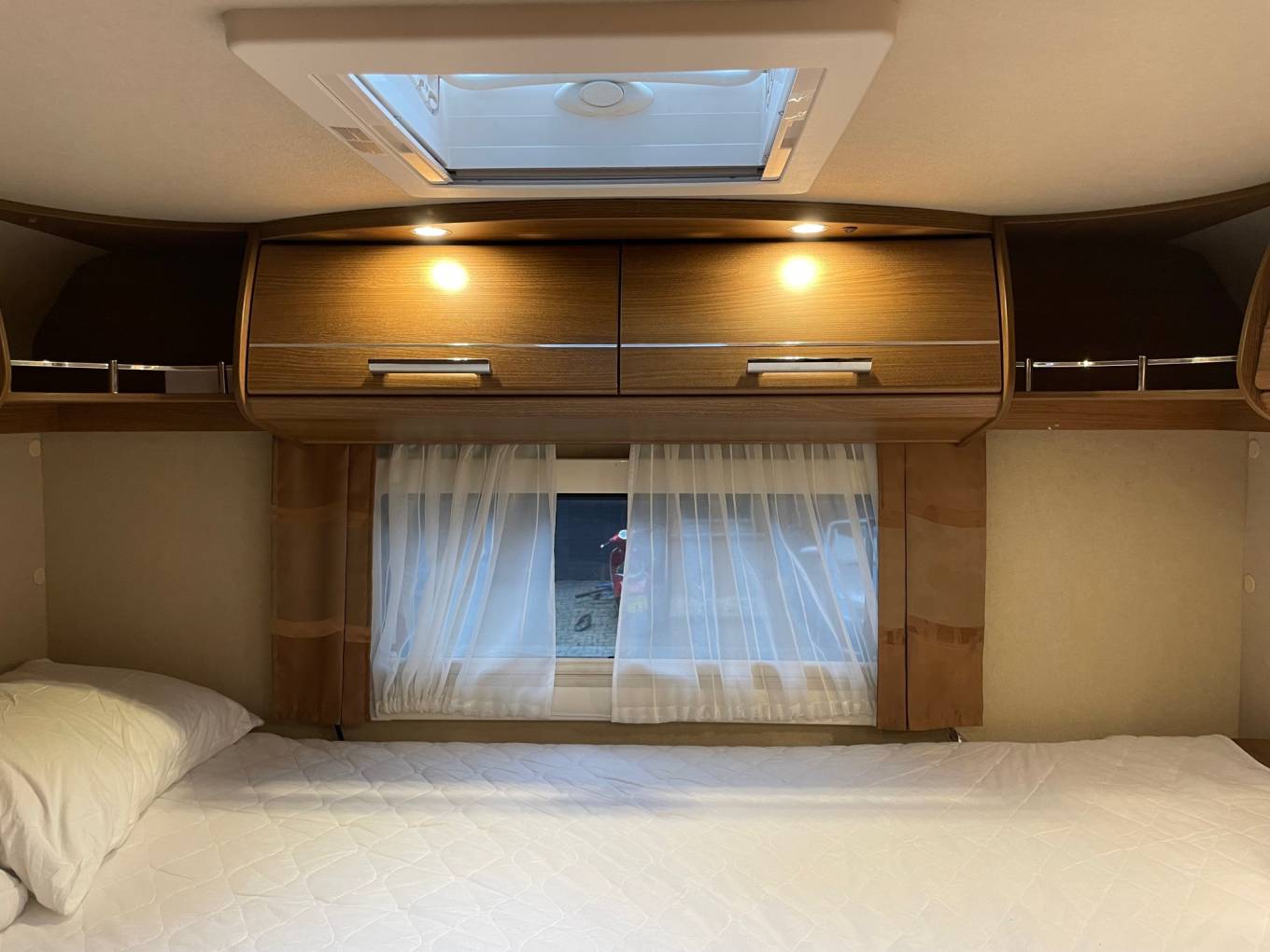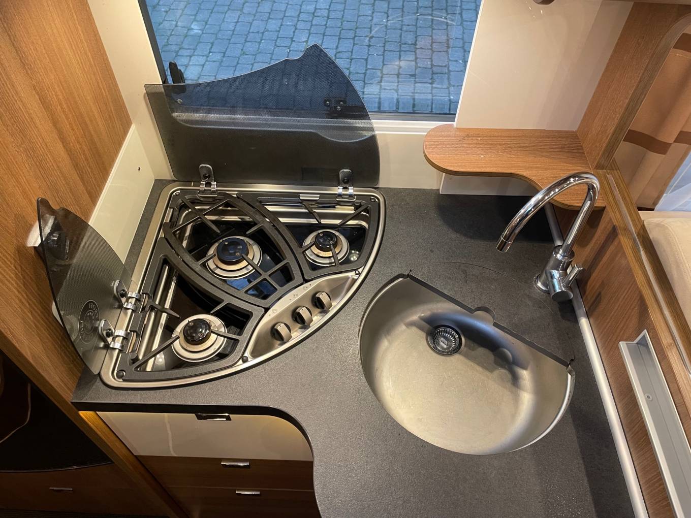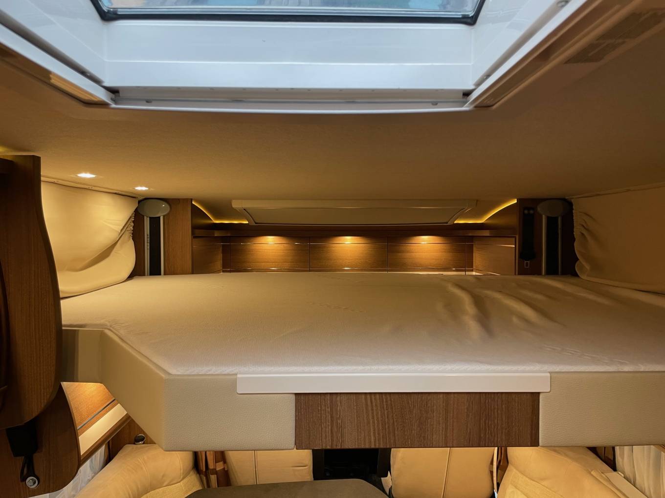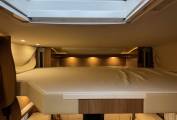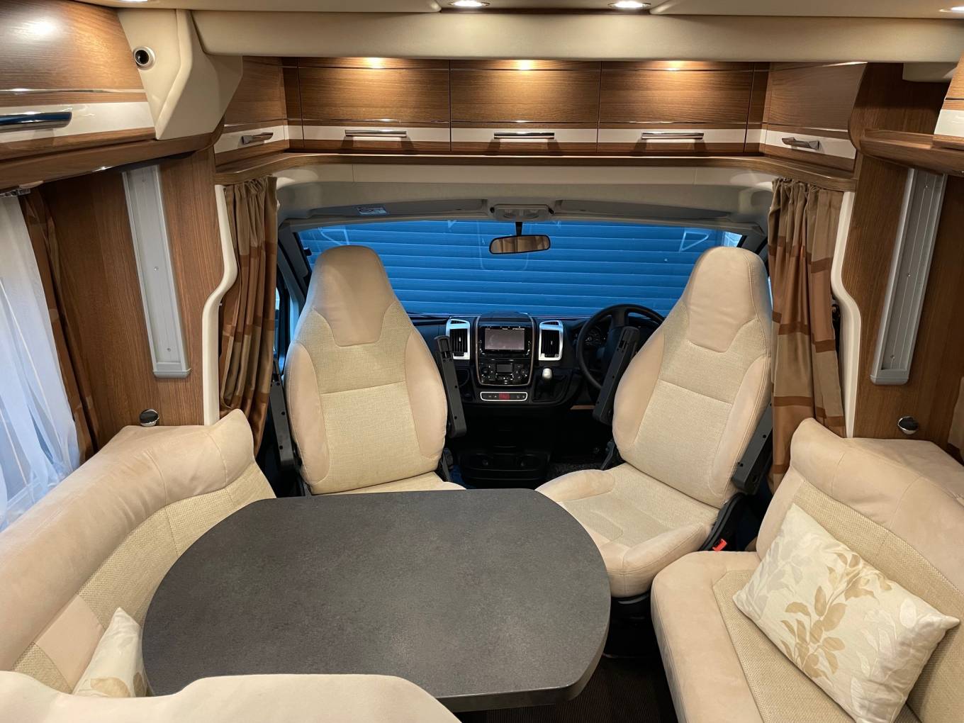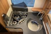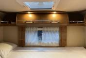 Excellent layout for a family with sleeping places for 2 people in the fixed double bed to the rear and 2 people in an electric lowering bed above the lounge area. There are 4 travelling seat belts and the popular shaped lounge can be used for dining and relaxing. The two front seats swivel to add to the lounge area.