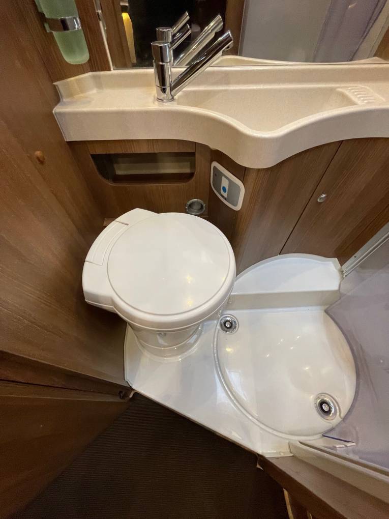 Wash-room has a shower, wash hand basin, cassette toilet and a vanity mirror. There are storage places and it is all tastefully done.