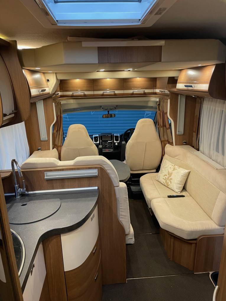 This luxury motorhome comes with a large specification list including a swivelling front seats, reverse camera, cruise control, Thule awning, cabin air con, a Phantom, Lifetime alarm and Tracker, Thule four bike rack, radio, electric step, large leisure battery for off grid camping, Trauma Heating and Boiler, and a 150W Solar Panel. It boasts having four new tyres, new Leisure Battery and new Regular Battery.
