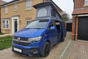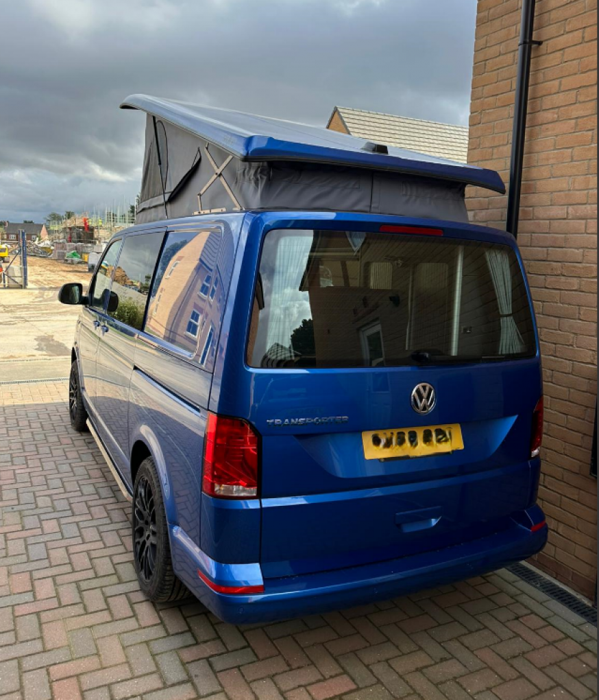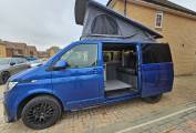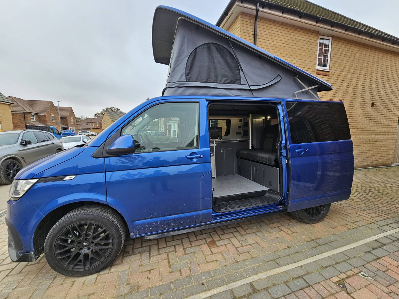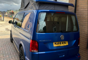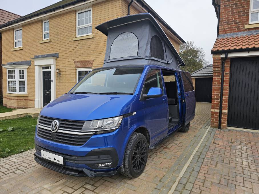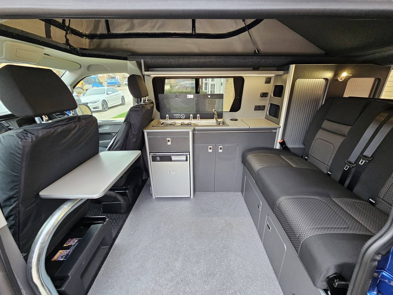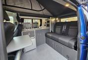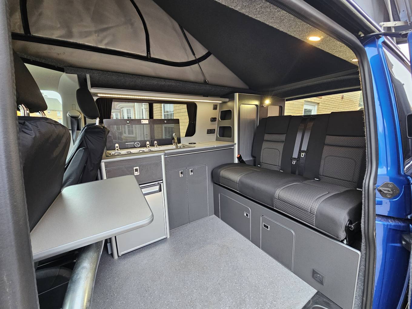 This Volkswagen Transporter campervan is packed with features and has a sporty modern look. It’s built on the stylish 16.1 body style, finished in a lovely blue, and it includes convenient electric folding mirrors, stylish black alloys and air conditioning, so you’re comfortable on every journey. Inside, you’ll find a YILKAR diesel heater to keep the interior warm during chillier nights, as well as a cab area fitted with a touchscreen display for easy access to navigation and apple play media.
