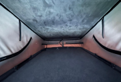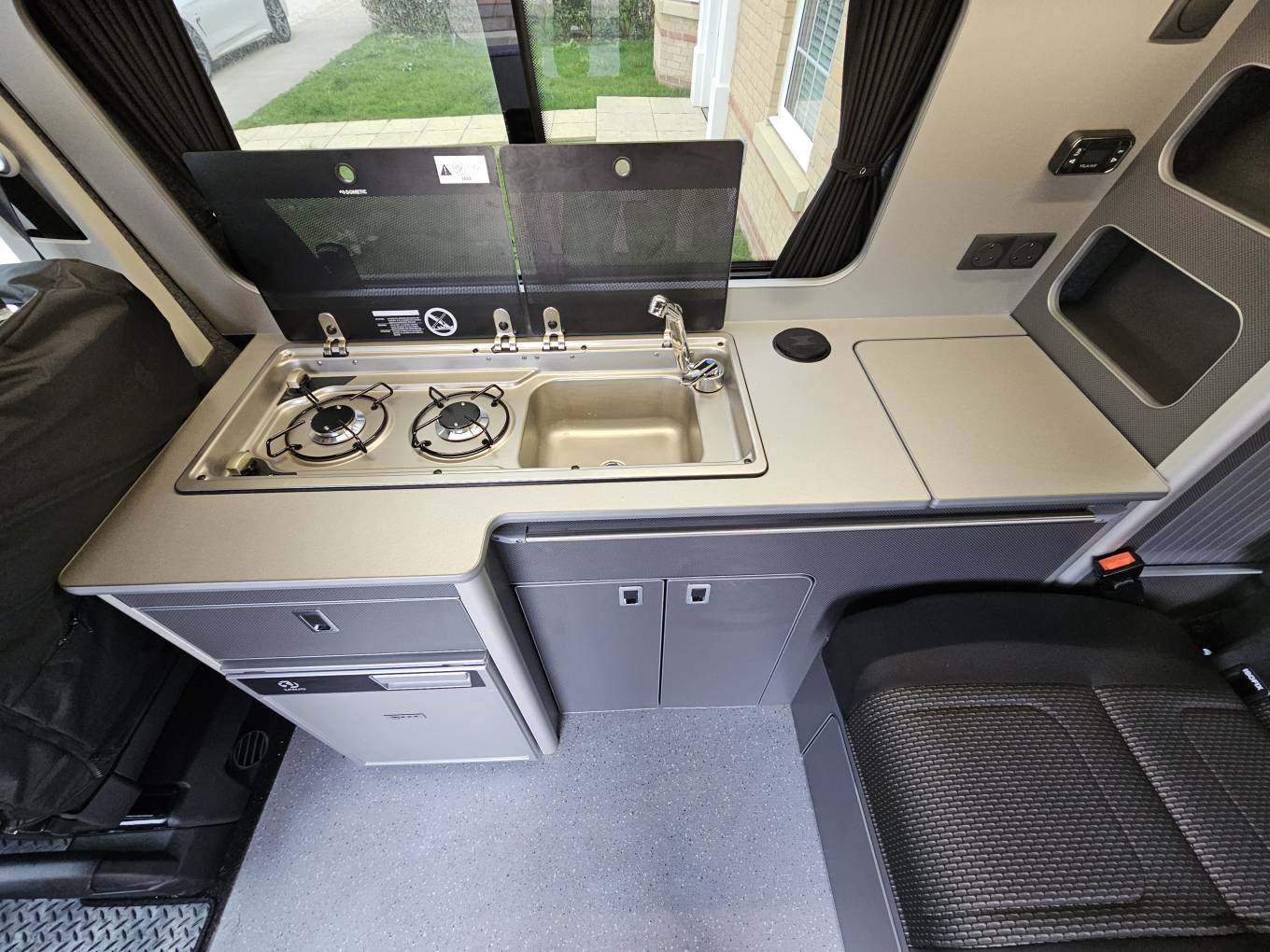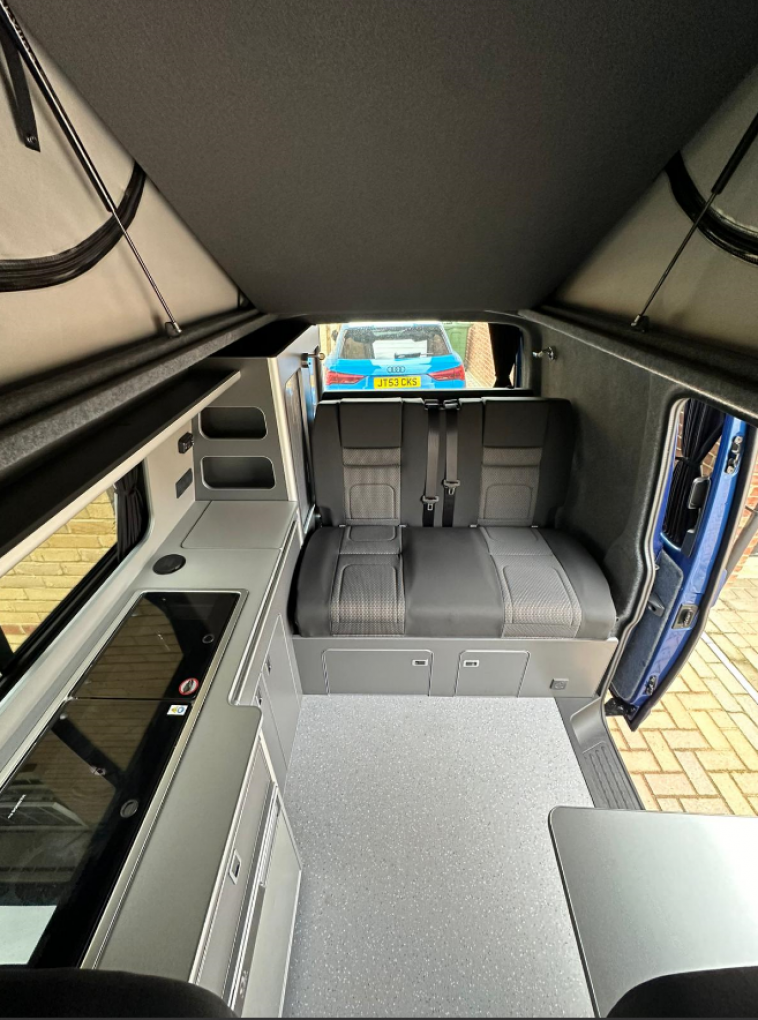 The layout is designed with versatility in mind, two captain seats in the front swivel to face a centre dinette table, creating a cosy dining or lounging area. The kitchen has a fridge-freezer, a two-burner gas hob, and a sink with a tap, making it easy on the road. For sleeping, there’s a rock ‘n roll bed that folds out in the main cabin to create 2 more belted seats, along with a pop-top bed, so you can comfortably sleep and travel up to four people.
