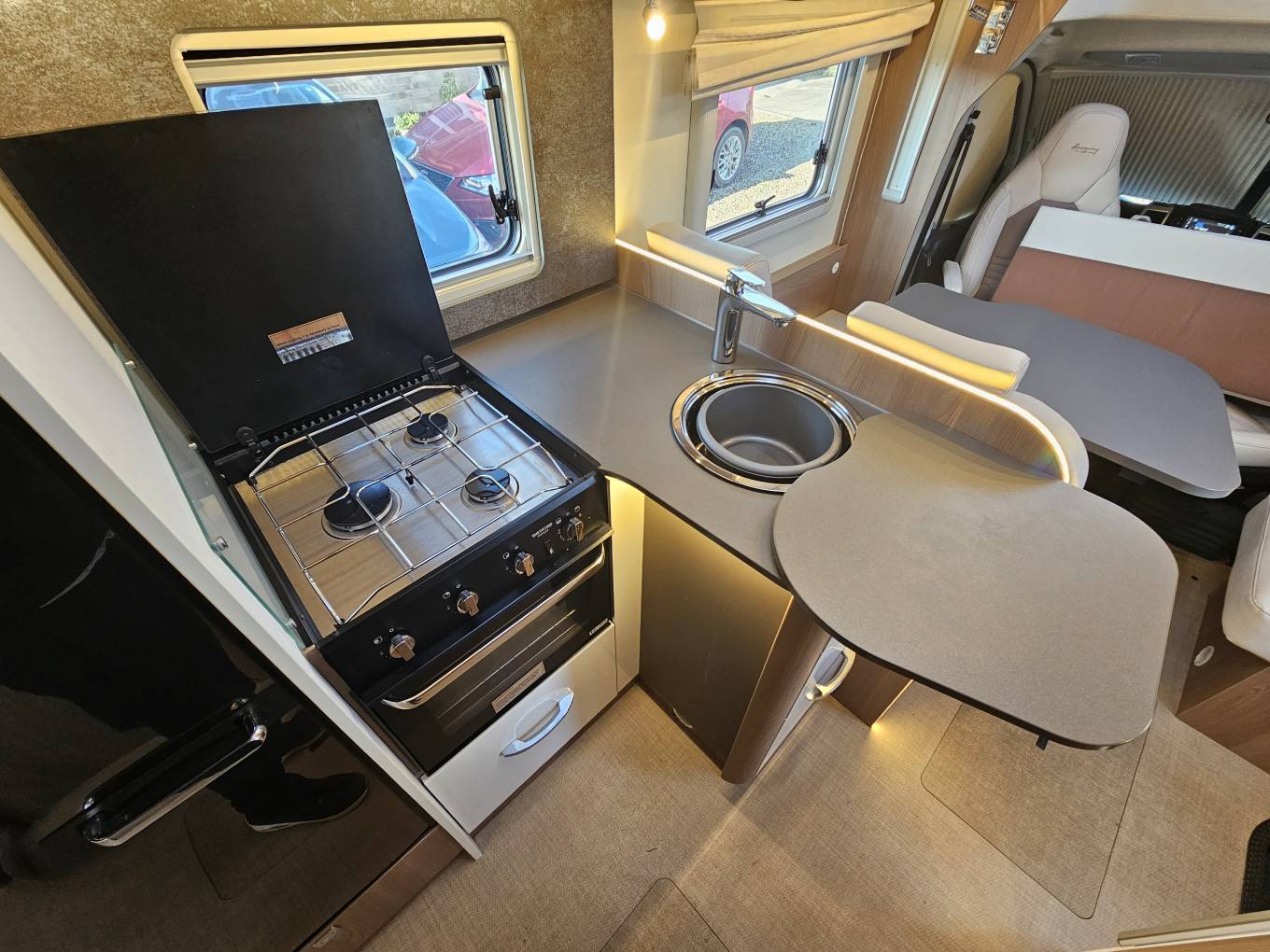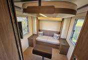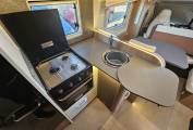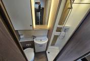 The kitchen, located in the centre of the van, is well equipped for everything from a quick morning coffee to full evening meals. It features a three burner gas hob, a combination oven and grill, a spacious fridge freezer, and a stylish sink with a chrome mixer tap. There’s plenty worktop space and plenty of overhead and under counter storage, all finished in Burstner’s signature high quality materials with warm LED lighting.