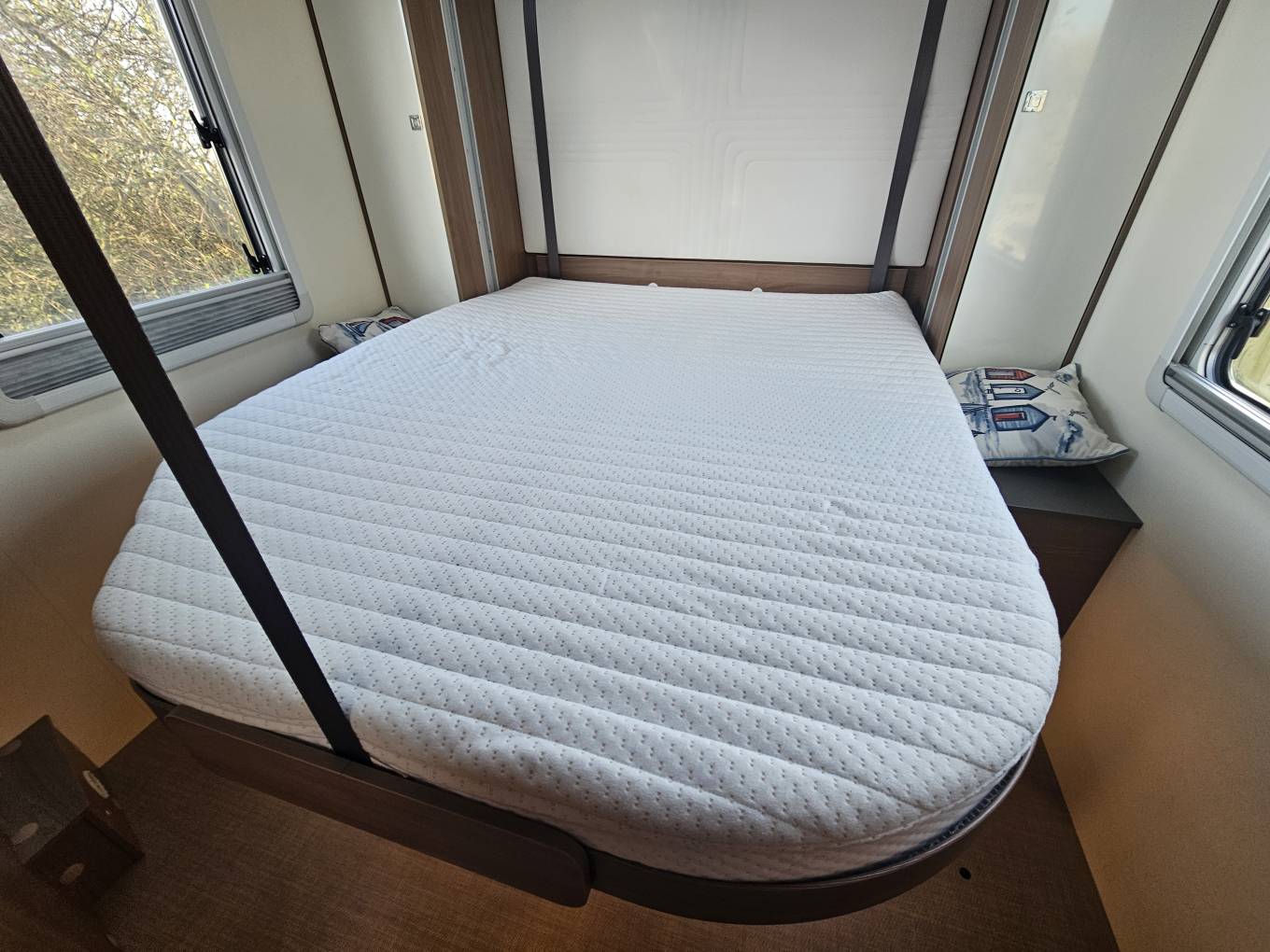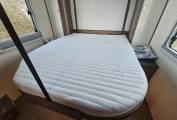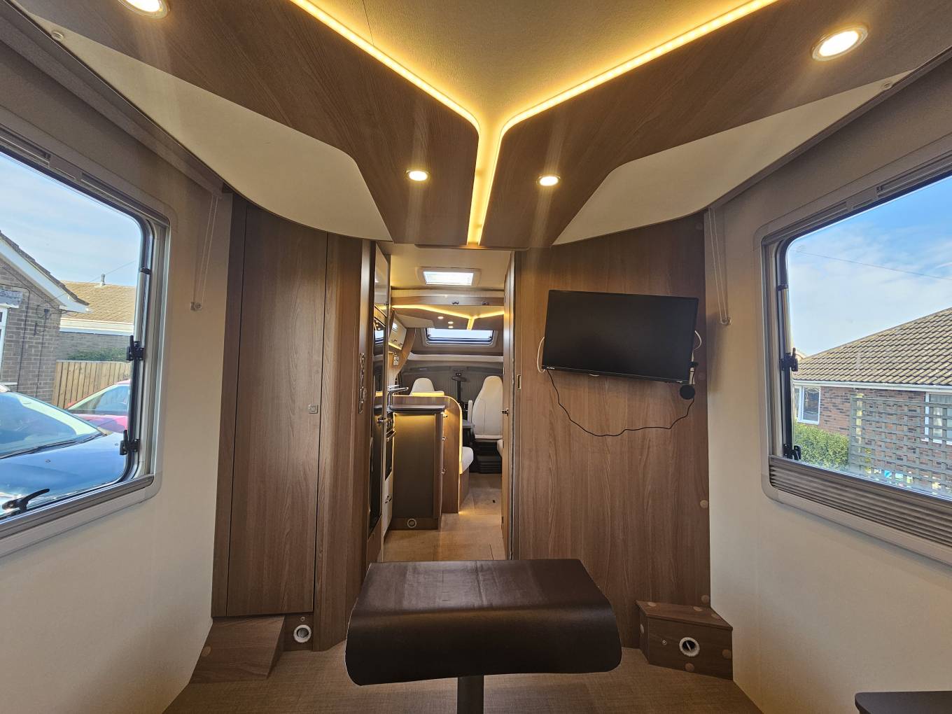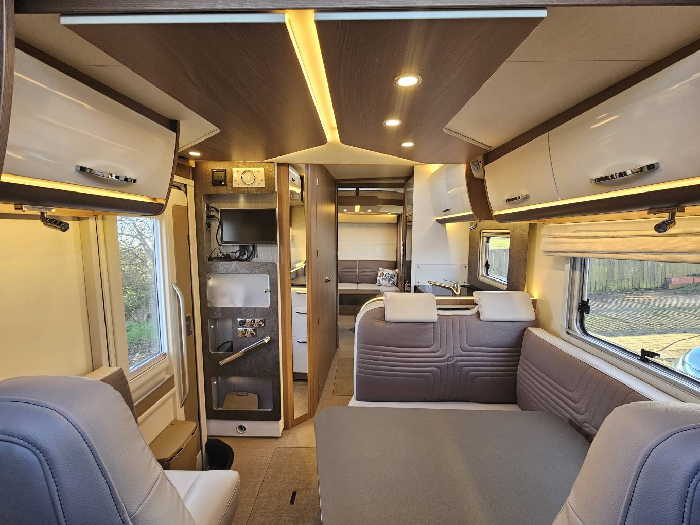 This motorhome is also packed with thoughtful extras that make life on the road even more easy. It includes cab air conditioning, a Truma Combi system for efficient heating and hot water whether you’re hooked up or off grid, and a fitted solar panel to keep your leisure batteries topped up during extended stays away. Externally, there’s a wind out awning for shaded outdoor living, a reversing camera, and a large garage at the rear for storing bikes, furniture, or bulky gear. Inside features like cruise control, premium upholstery, flyscreens and blackout blinds on all windows and rooflights, plus a flyscreen door.
