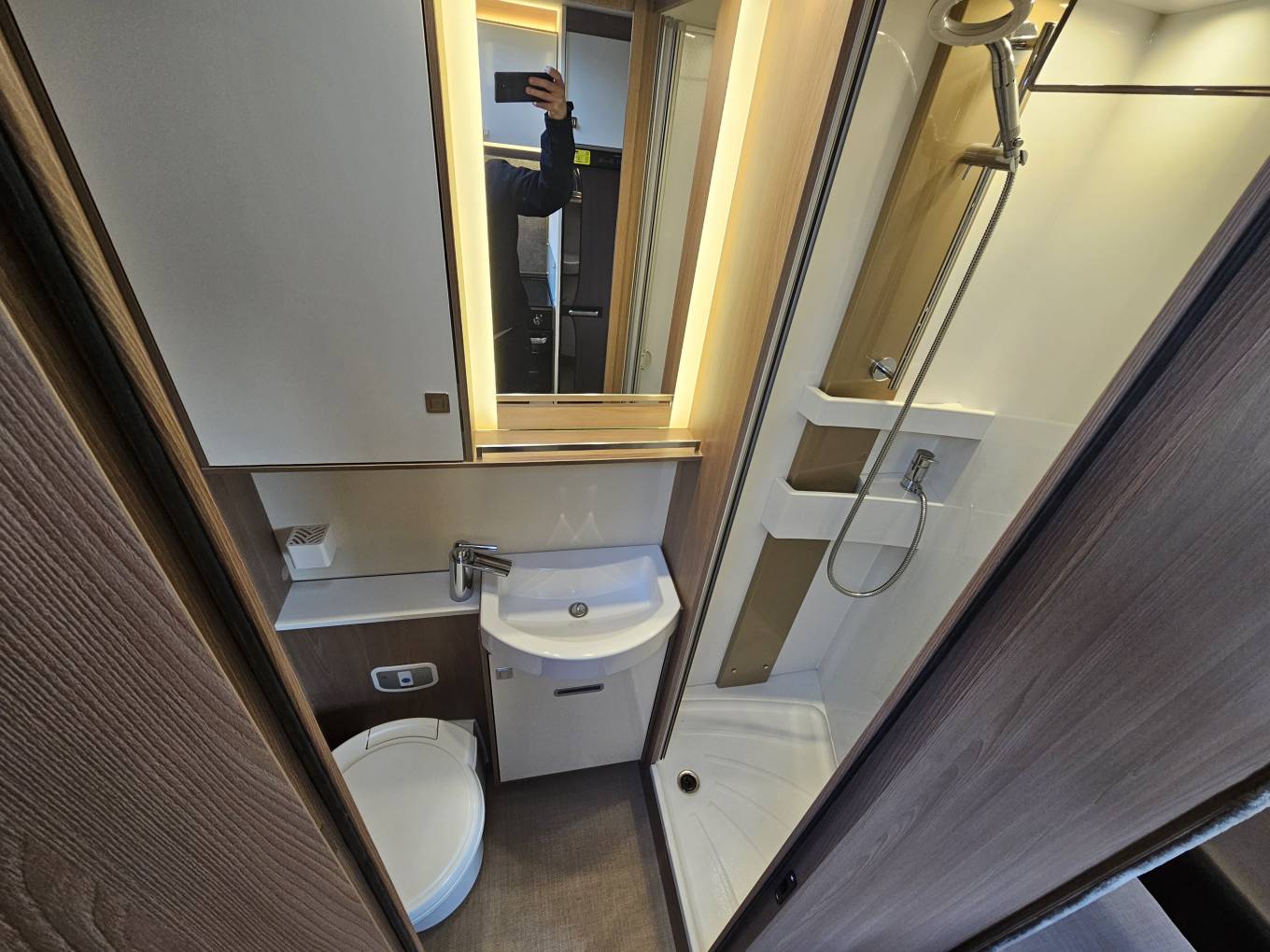 At the front, a comfortable lounge area features side-facing sofas and swivel captain’s chairs. Above the lounge is an electric drop down bed that lowers when needed and stows neatly away during the day, giving you the flexibility to travel with friends or family without compromising space. The rear of the motorhome has a electric drop down Island bed while the central washroom area has a separate enclosed shower cubicle on one side and a toilet with washbasin and storage on the other, giving you the feel of an ensuite setup with added privacy.