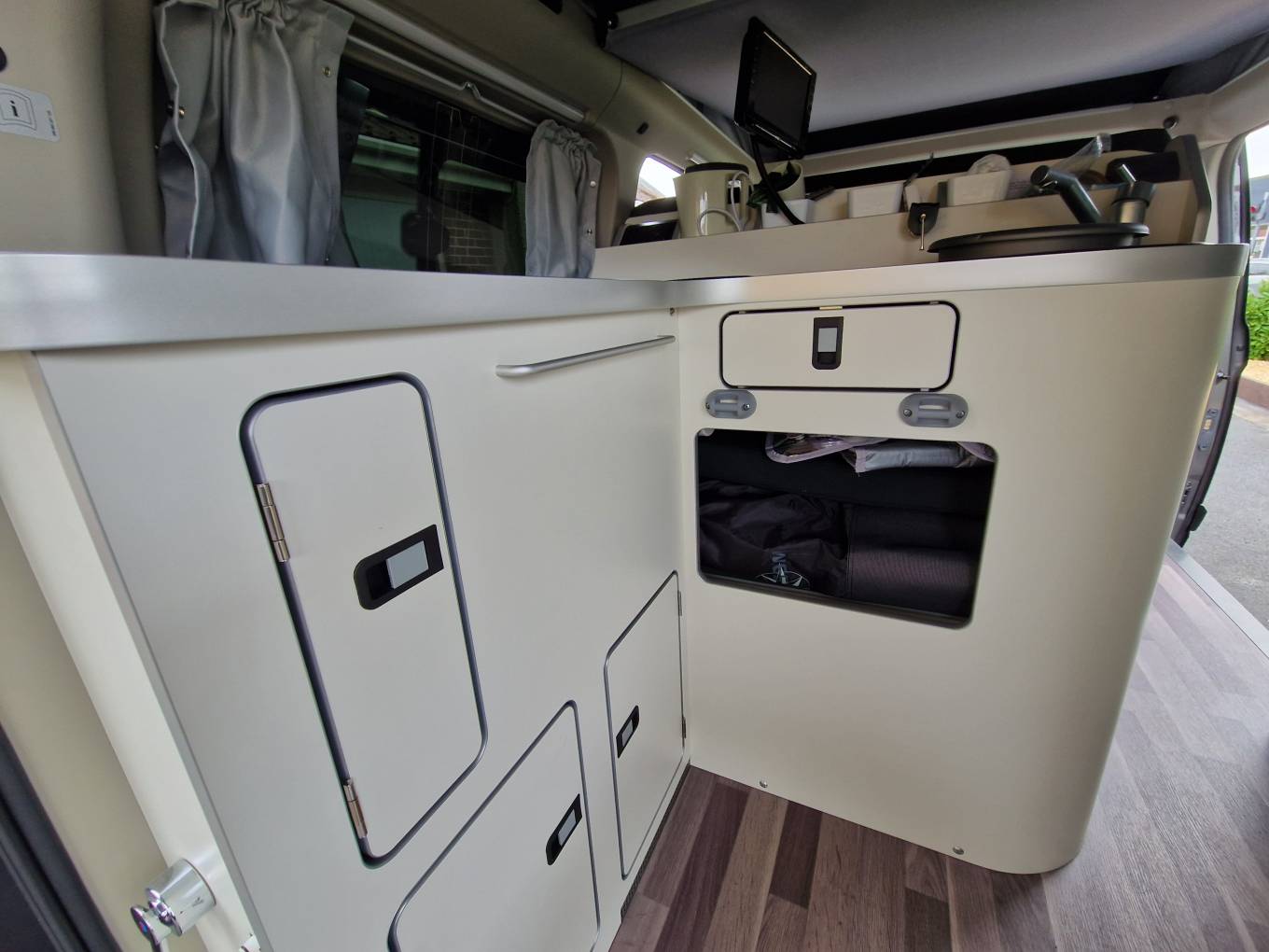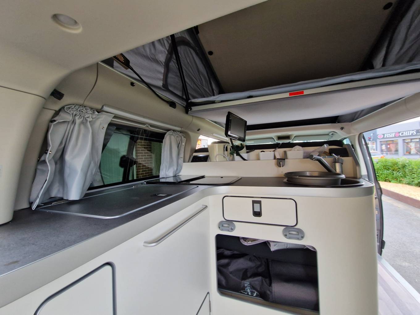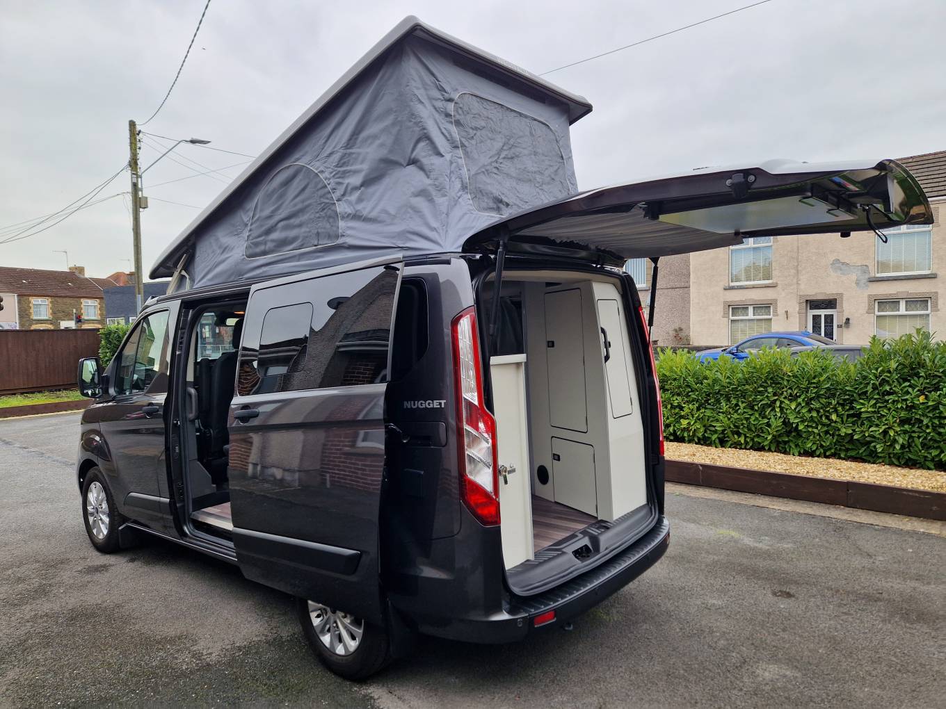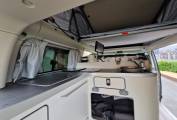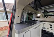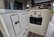 The Nugget has a very clever layout and makes the most of the size available. At the front you have a perfect seating area making use of the two front seats and a double rear seat. There is also a cleverly stored table that can be set up in the middle. Moving back the camper has great kitchen area - with plenty of head room with the Pop-top roof up. It has a large cool box style fridge, hob with 2 burners and sink with hot and cold water. The camper is also ideal to sleep in with a good sized double that is made up from the rear sofa and a further double in the Pop-top.The camper also comes with heating and hot water - all operated through the simple to use 12 volt control panel.
