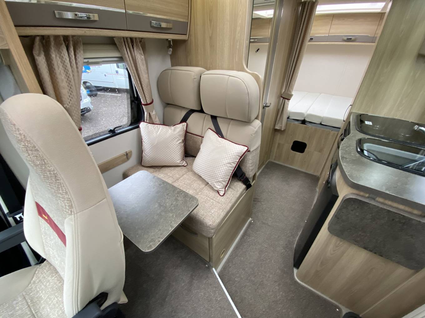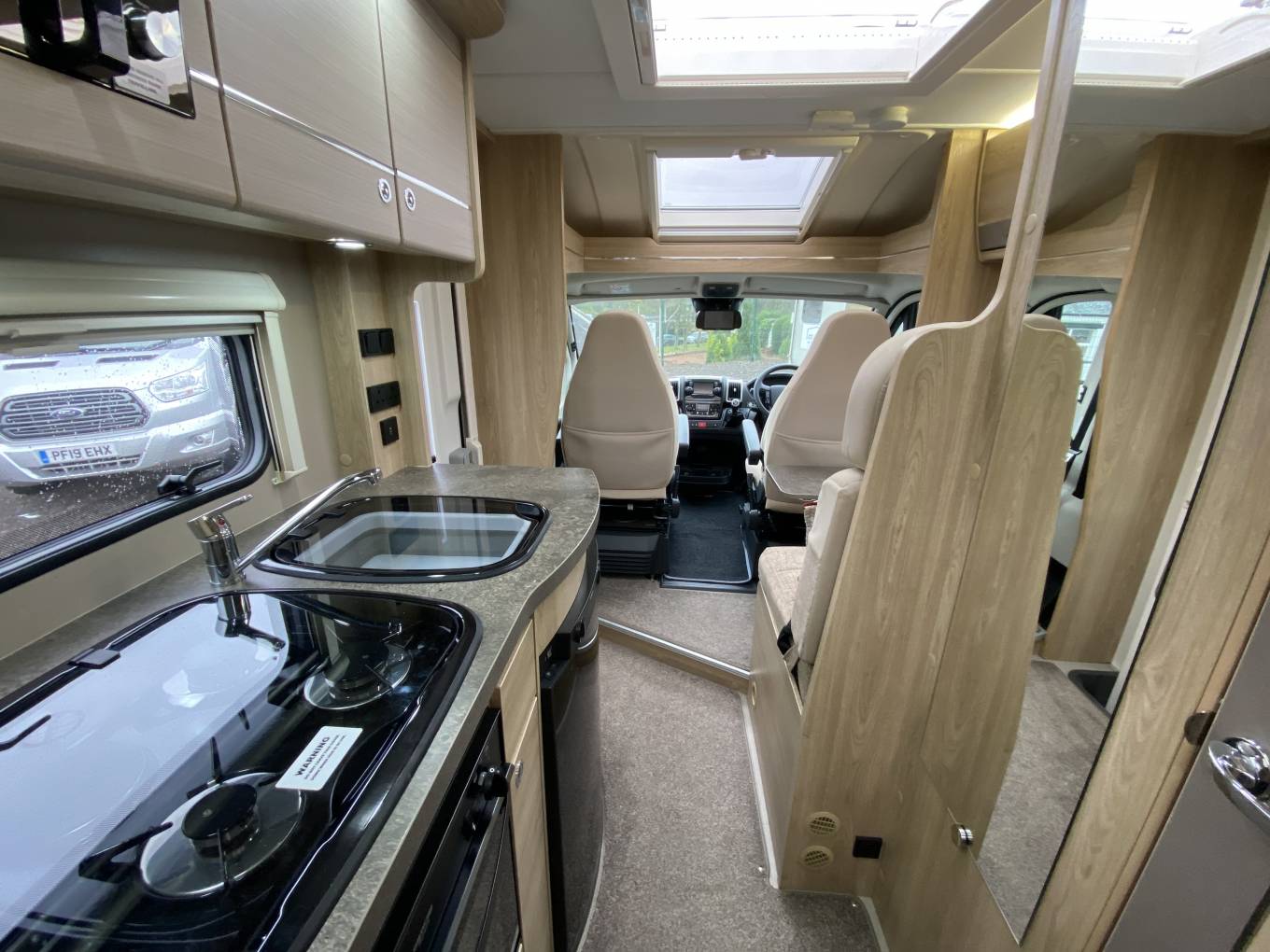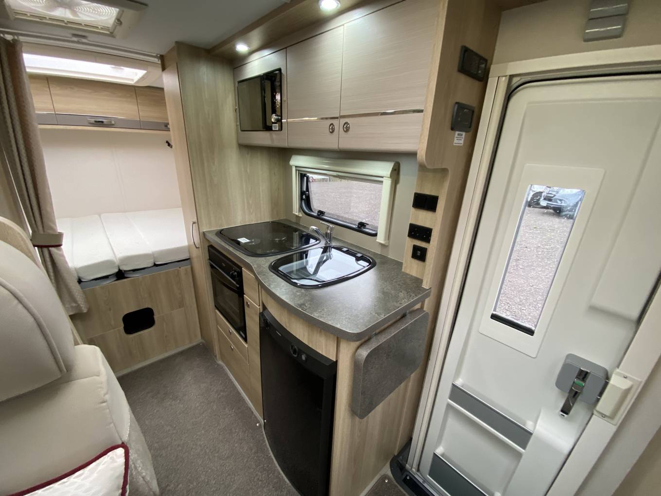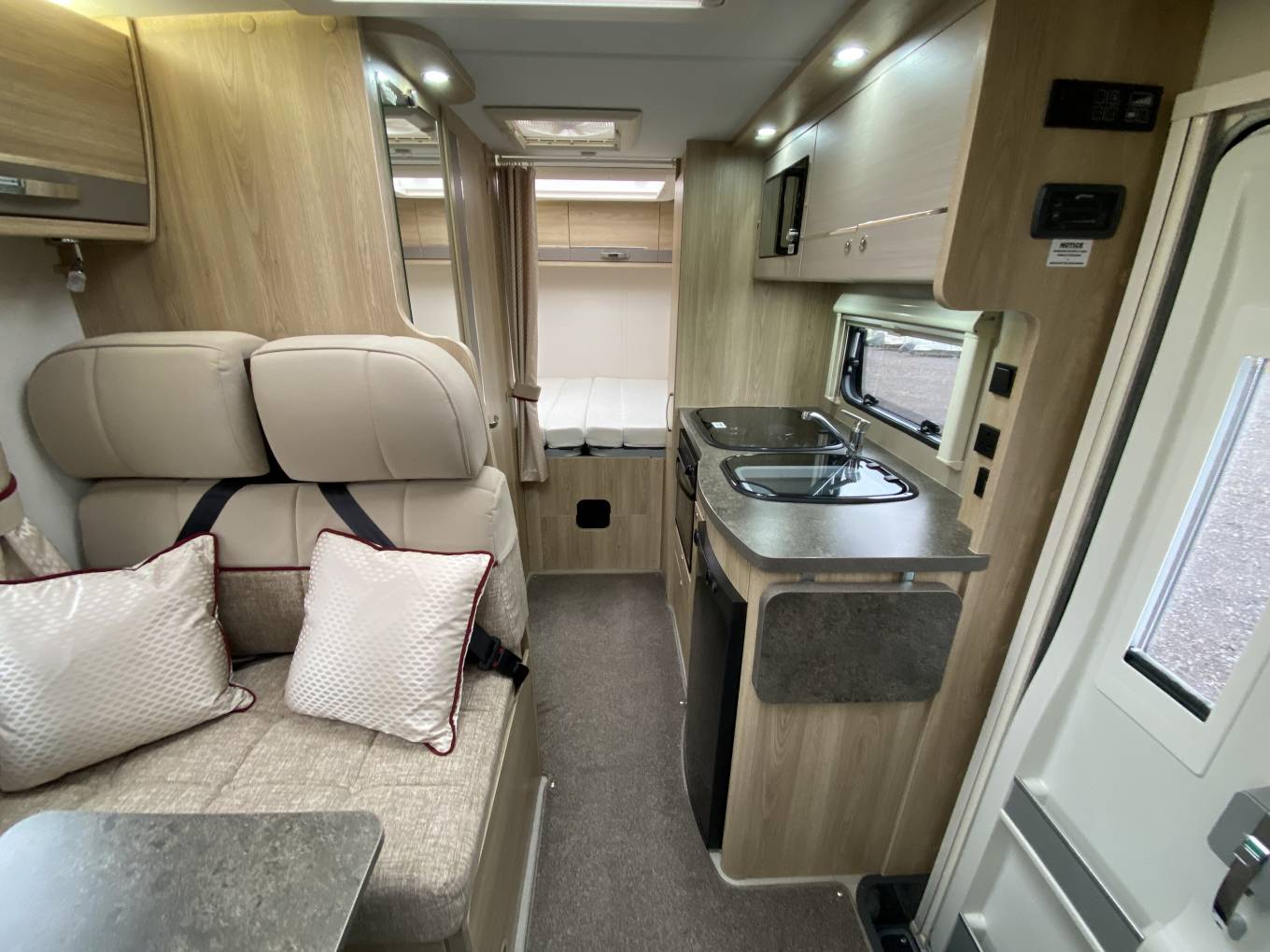 The layout is from behind the front cab there is a front facing 2 seater sofa fitted with 2 seat belts plus a small table. Both front seats swivel and when the driver seat is turned it can be used in conjunction with the sofa to make a single bed. The mid-kitchen has a dual-fuel hob with an electric hotplate and 3 gas burners, an oven and grill and a Daewoo microwave. The Dometic fridge freezer runs off electric, gas and the leisure battery. There is a roof mounted fan to allow for cooking smells to escape or alternatively to circulate air in the vehicle. Opposite the kitchen is the washroom and here you have a shower, a modern wash basin with a mixer tap a Thetford cassette toilet, a large mirror and a bathroom cabinet for your toiletries. The rear bedroom has a fixed transverse bed with a foam mattress and there are numerous bedroom storage lockers and the large skylight opens to allow a summer breeze in and underneath you have a spacious garage for extra storage.
