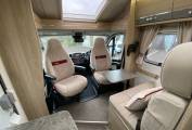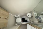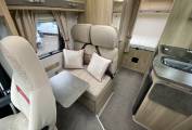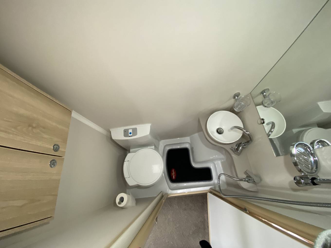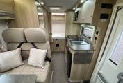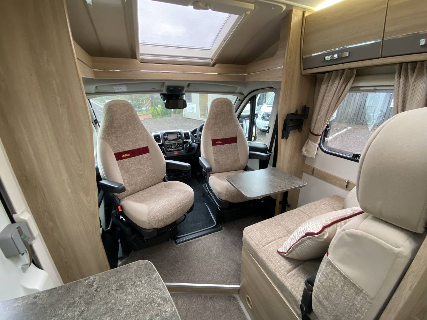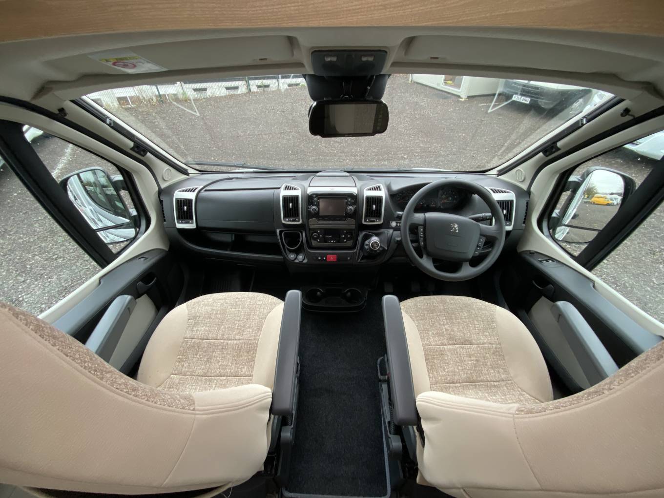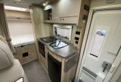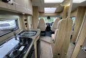 The layout is from behind the front cab there is a front facing 2 seater sofa fitted with 2 seat belts plus a small table. Both front seats swivel and when the driver seat is turned it can be used in conjunction with the sofa to make a single bed. The mid-kitchen has a dual-fuel hob with an electric hotplate and 3 gas burners, an oven and grill and a Daewoo microwave. The Dometic fridge freezer runs off electric, gas and the leisure battery. There is a roof mounted fan to allow for cooking smells to escape or alternatively to circulate air in the vehicle. Opposite the kitchen is the washroom and here you have a shower, a modern wash basin with a mixer tap a Thetford cassette toilet, a large mirror and a bathroom cabinet for your toiletries. The rear bedroom has a fixed transverse bed with a foam mattress and there are numerous bedroom storage lockers and the large skylight opens to allow a summer breeze in and underneath you have a spacious garage for extra storage.