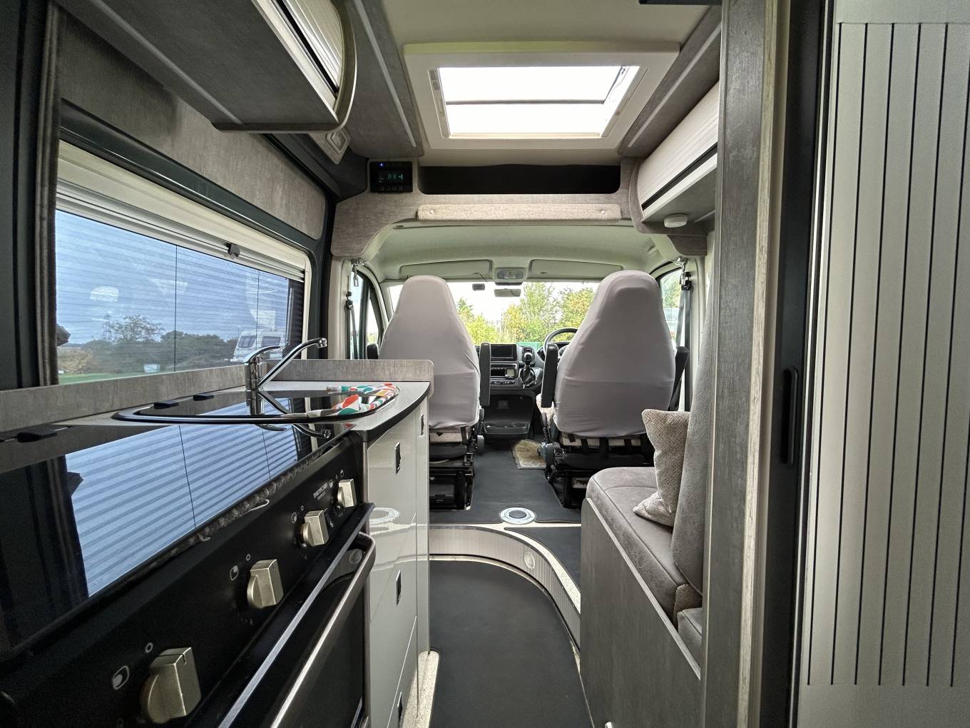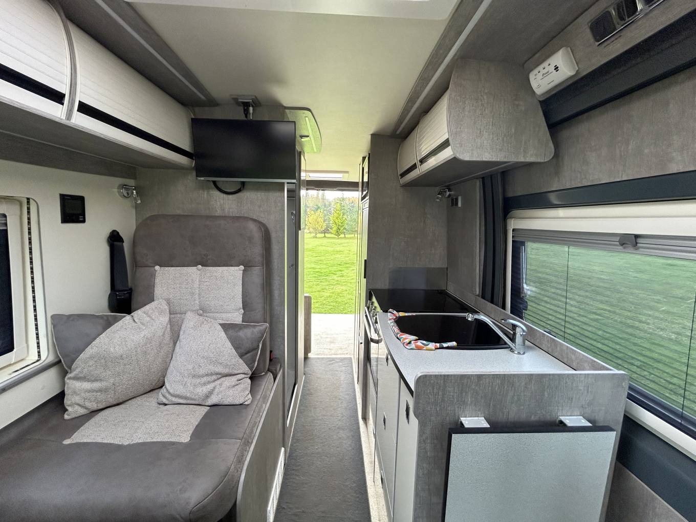 Probably the standout feature of this gorgeous motorhome is the cavernous storage space at the rear of the vehicle which is so large you could fit a motorbike in there. There is a fixed rear transverse bed which folds up while travelling to create the impressive space. The front dinette area converts into a single bed giving 3 sleeping berths in total.