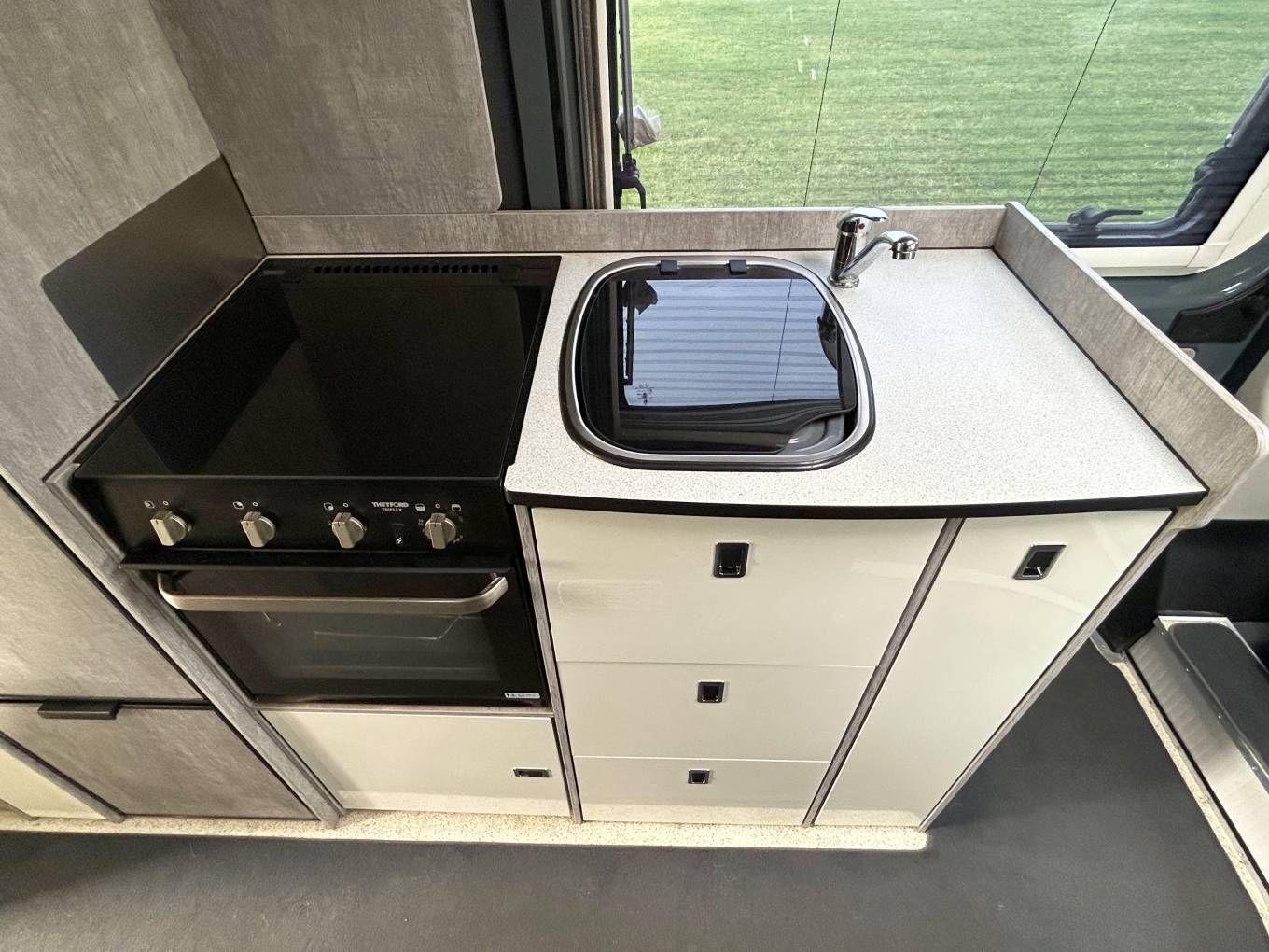 The washroom has everything you need to keep you fresh on your travels including a shower, a wash basin and mixer tap, a bathroom cabinet for your toiletries and a large mirror. There is a Thetford cassette toilet with electric flush and a roof light to allow fresh air in.