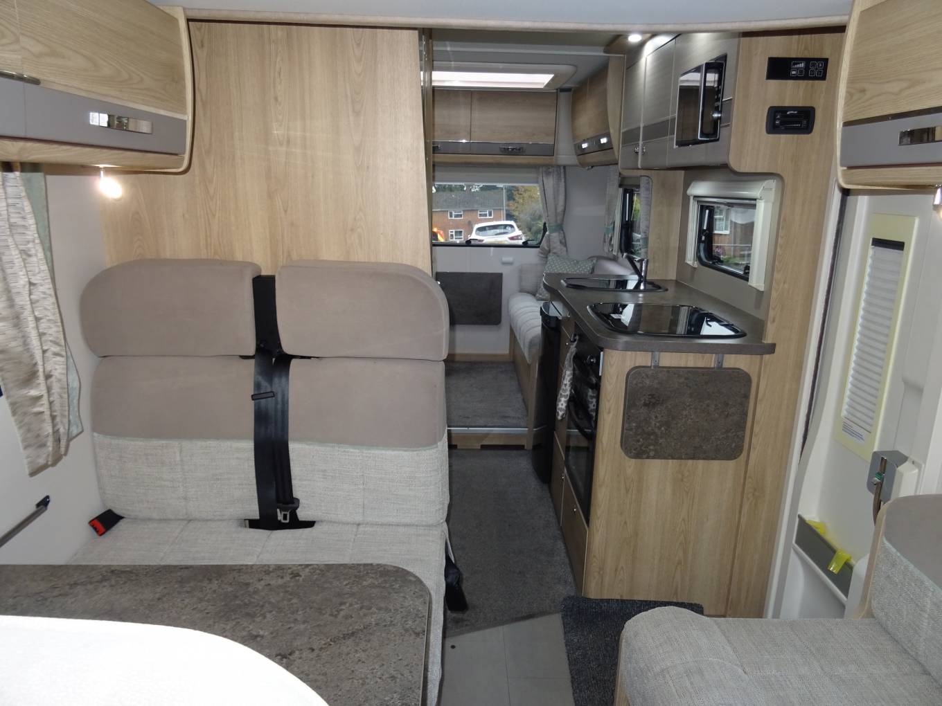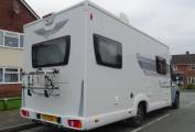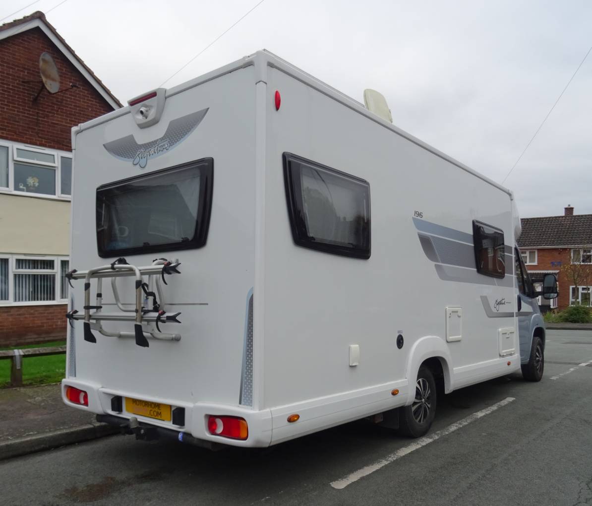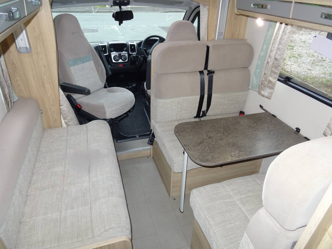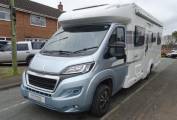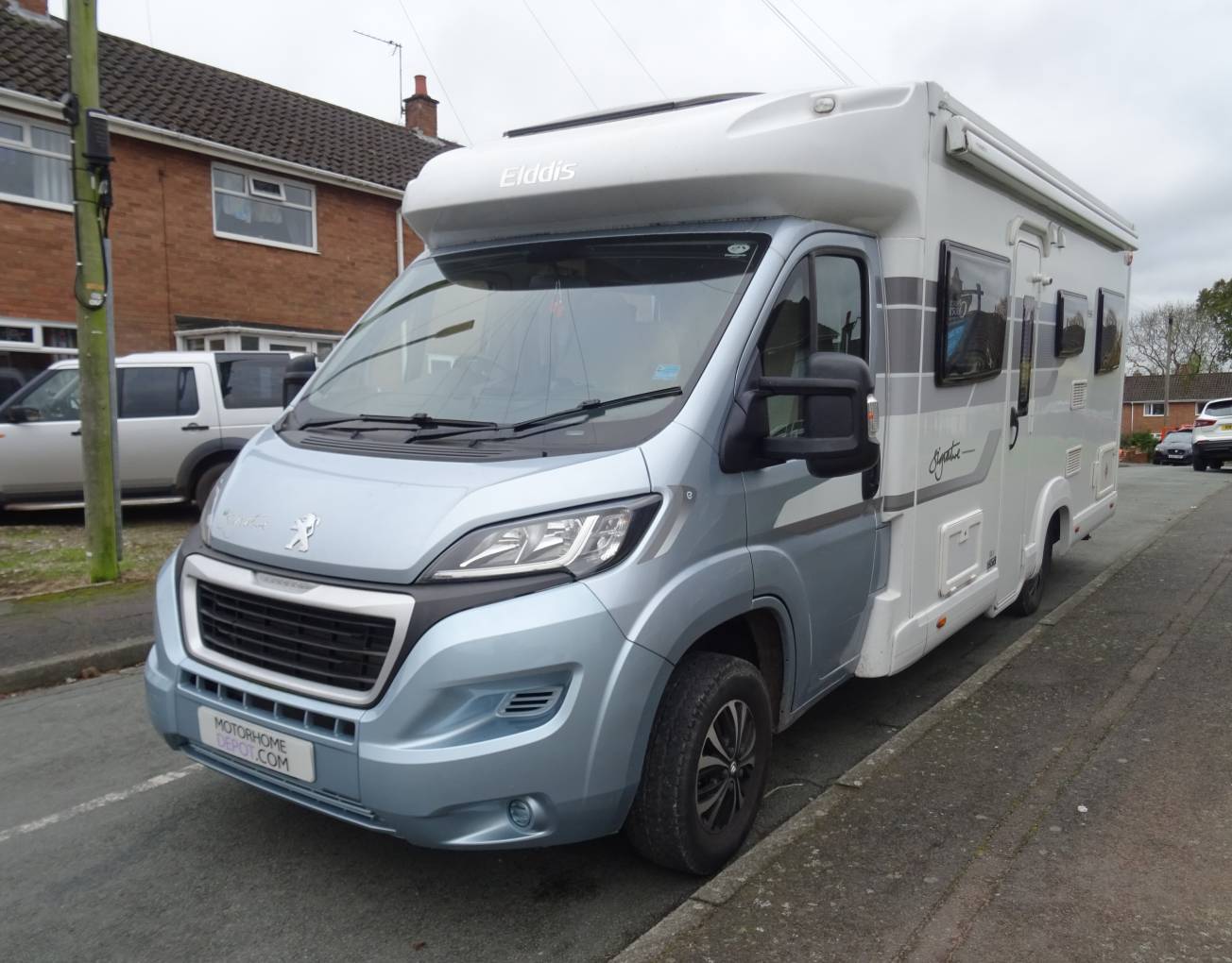 This 2019 model Elddis Signature 196, which is a dealer special Autoquest. It's based on a Peugeot chassis with a 2.2 L 130 BHP engine paired to a 6-speed manual gearbox. The Elddis Signature 196, is six berth, six belt, has a front dinette area comprising two facing bench seats with seat belts and one side facing bench seat, this area can easily be converted into a good size double bed when required, above is the neatly concealed electric drop-down double bed. The centre kitchen comes with a 3-burner gas hob plus 240v hotplate, grill, full oven, microwave oven and a 3-way fridge/freezer and opposite the kitchen is the wash/wc/shower room. Through to the rear is the light and airy lounge which again converts into a good size double bed when required. This vehicle also comes with Wi-Fi, cab air con, driver and passenger airbags, reversing camera, cruise control, radio, multi-function steering wheel, Bluetooth, awning, external shower, bike rack (2 bikes), tow bar, solar panel. Elddis are part of the Erwin Hymer Group of companies.