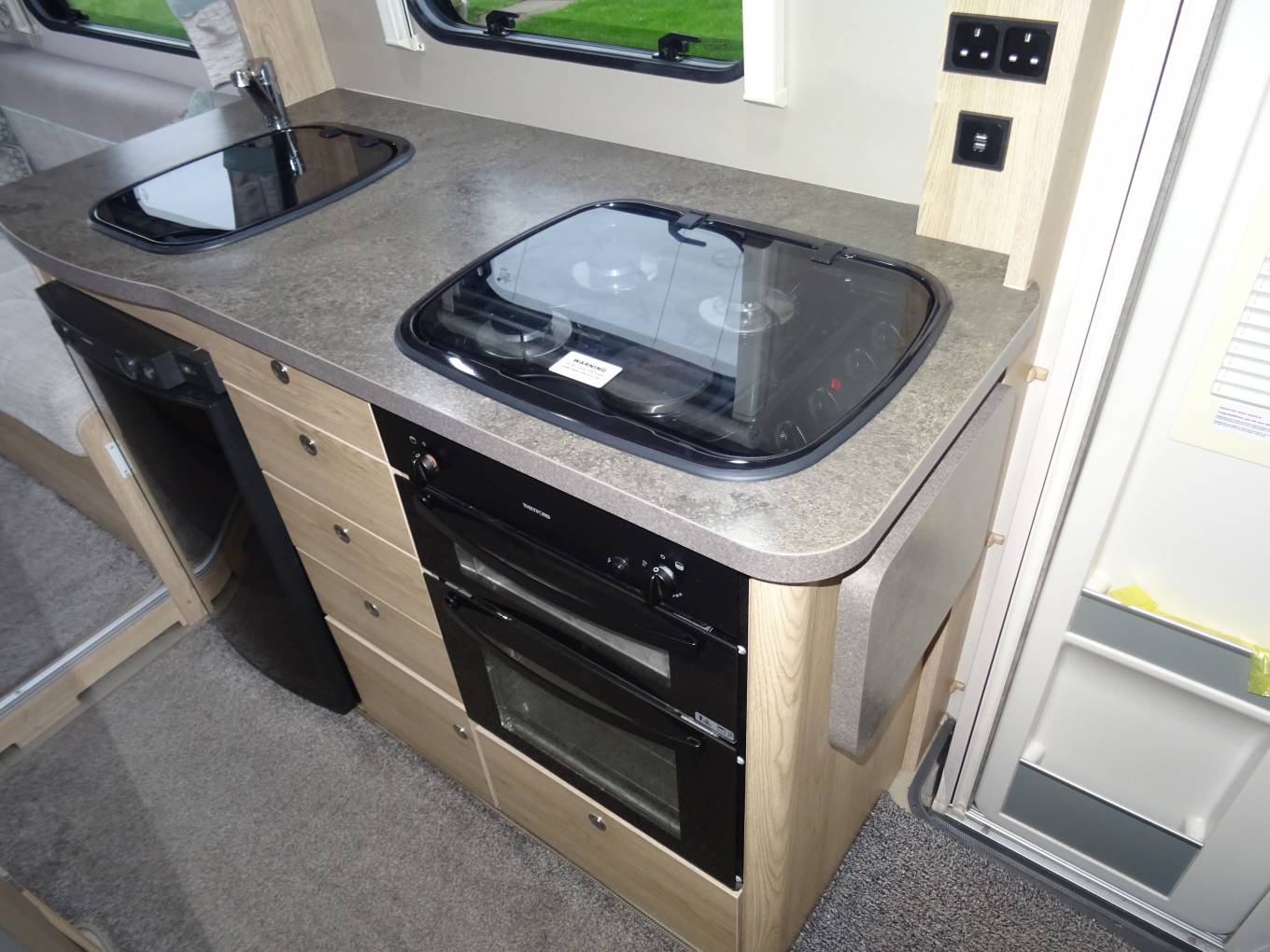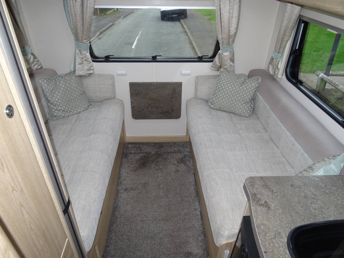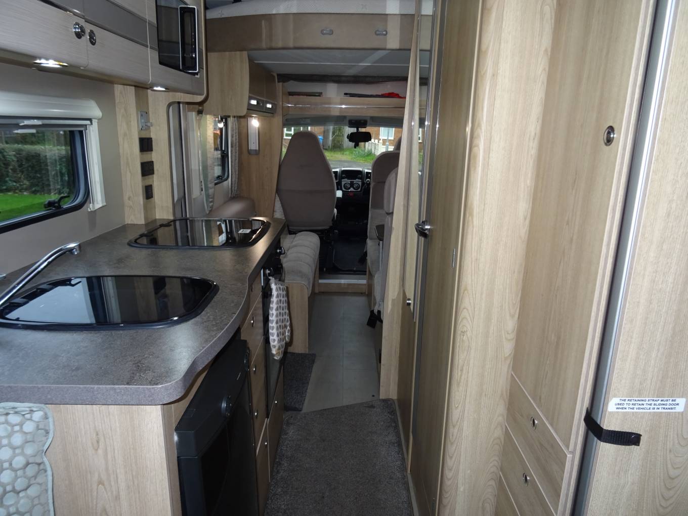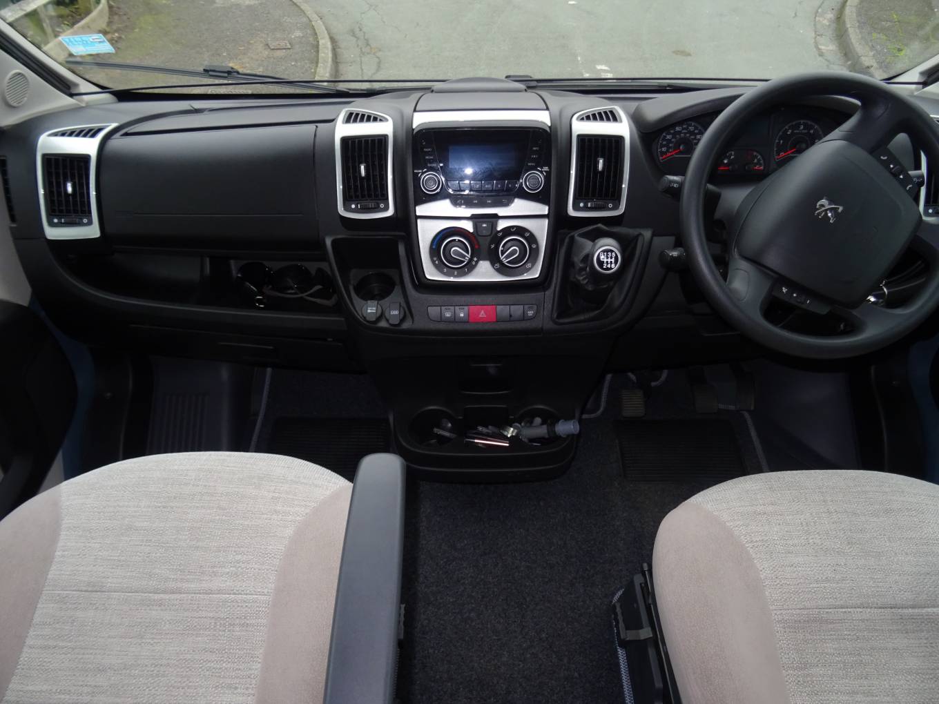 This 2019 model Elddis Signature 196, which is a dealer special Autoquest. It's based on a Peugeot chassis with a 2.2 L 130 BHP engine paired to a 6-speed manual gearbox. The Elddis Signature 196, is six berth, six belt, has a front dinette area comprising two facing bench seats with seat belts and one side facing bench seat, this area can easily be converted into a good size double bed when required, above is the neatly concealed electric drop-down double bed. The centre kitchen comes with a 3-burner gas hob plus 240v hotplate, grill, full oven, microwave oven and a 3-way fridge/freezer and opposite the kitchen is the wash/wc/shower room. Through to the rear is the light and airy lounge which again converts into a good size double bed when required. This vehicle also comes with Wi-Fi, cab air con, driver and passenger airbags, reversing camera, cruise control, radio, multi-function steering wheel, Bluetooth, awning, external shower, bike rack (2 bikes), tow bar, solar panel. Elddis are part of the Erwin Hymer Group of companies.