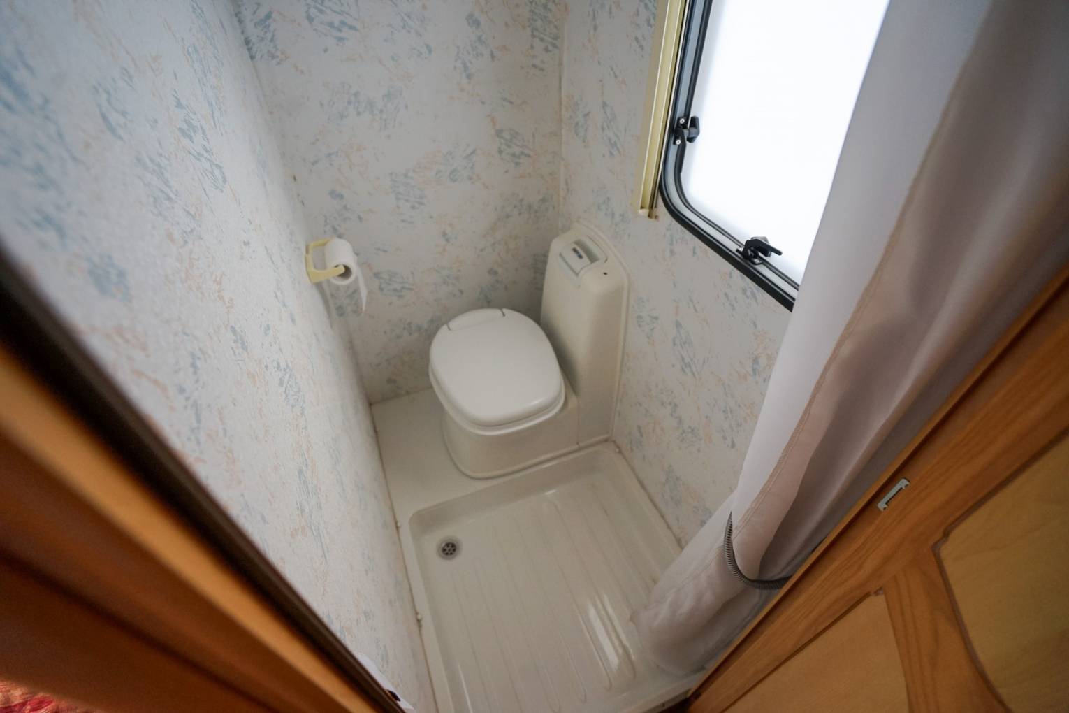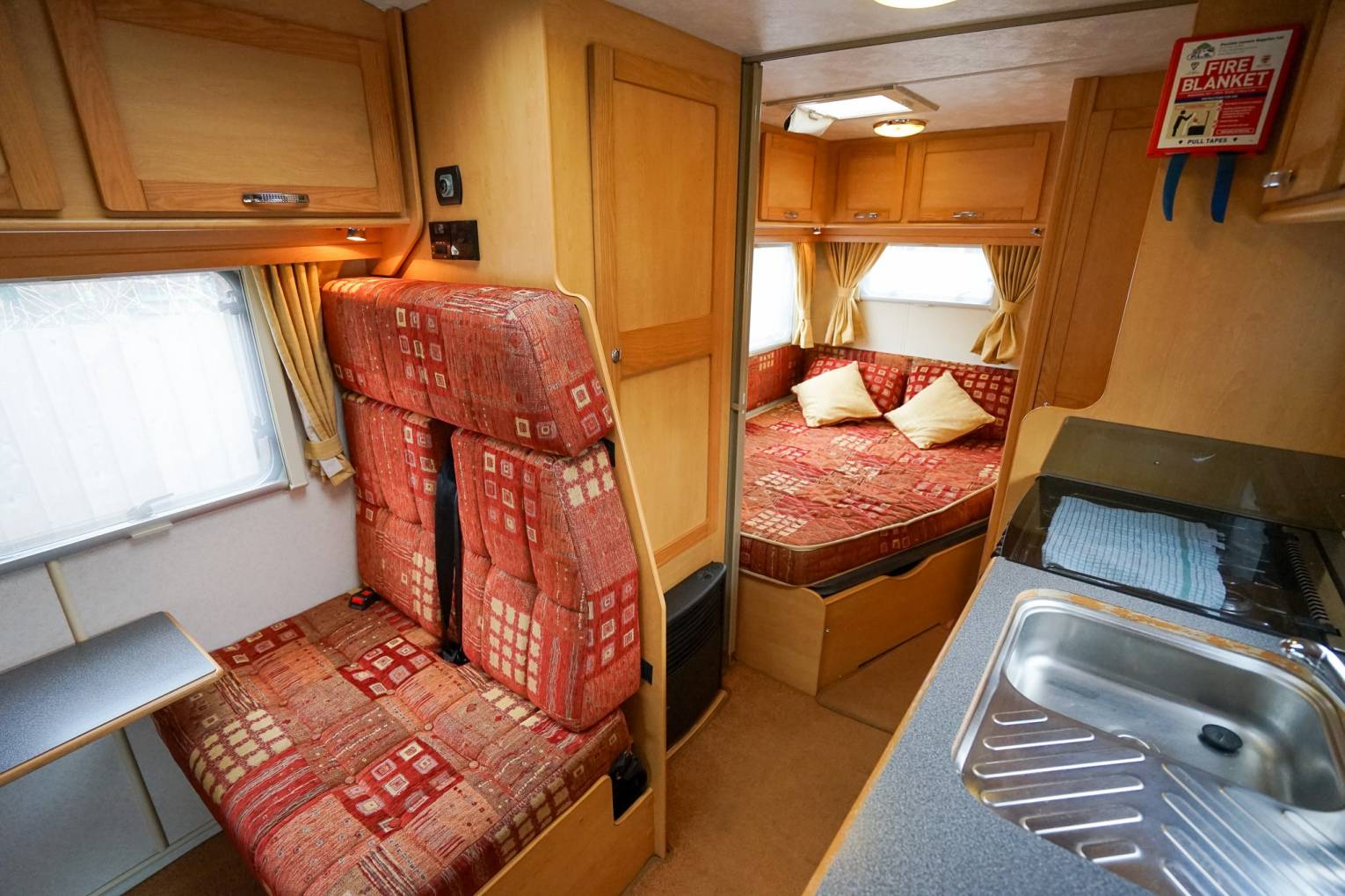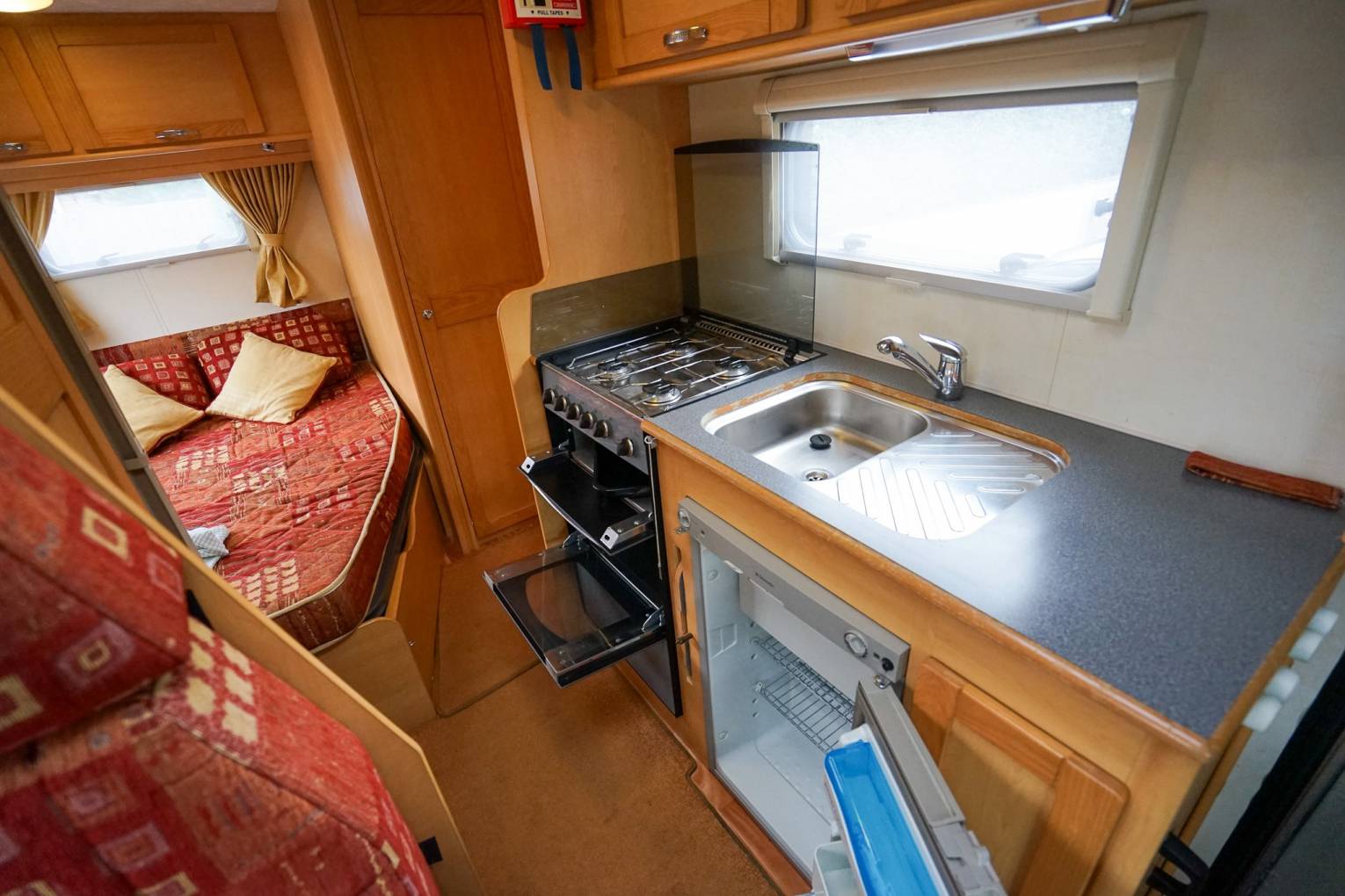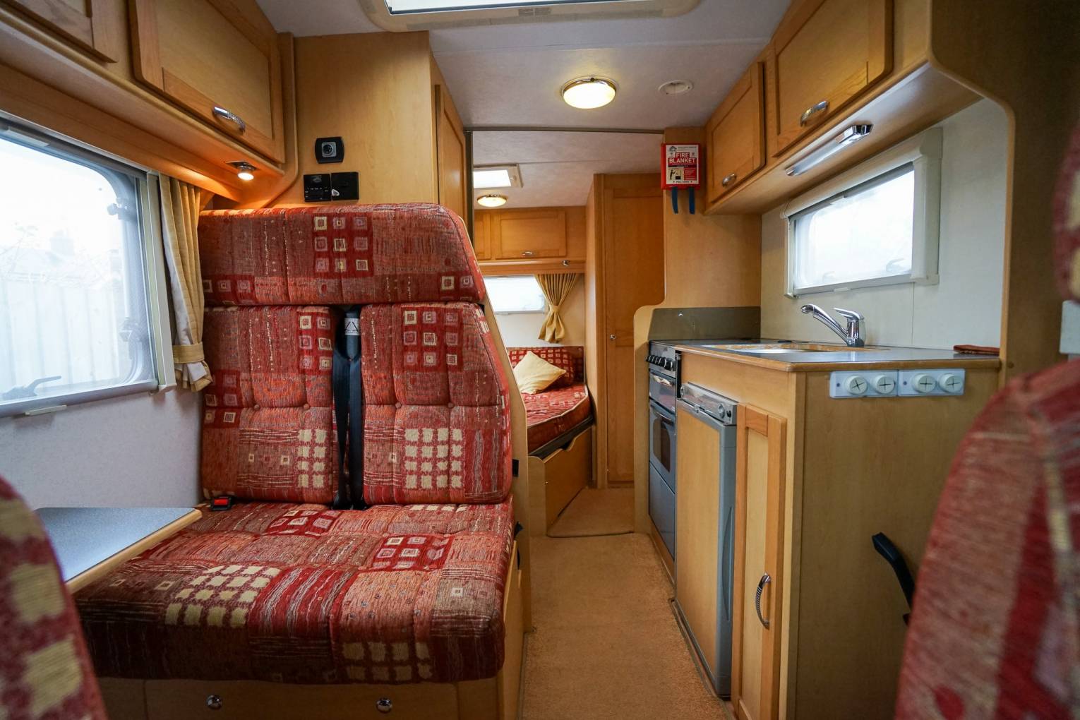 At the rear of the motorhome is a fixed French bed which