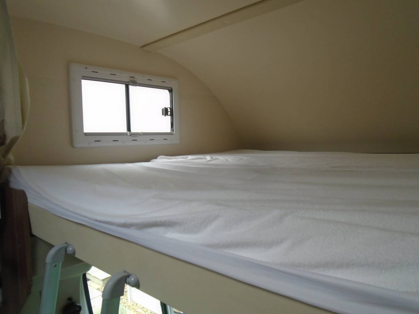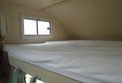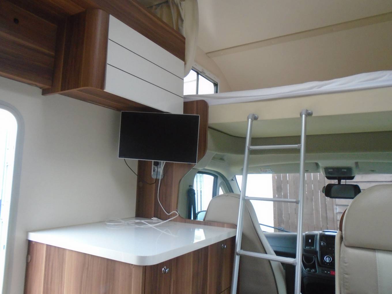 Other cab features include cab air conditioning, digital heating controls, cruise control, rear view camera and insulating mats to screen off the cab at night. Behind the cab is the pullman style dinette, two double seats opposing a table and fitted with 4 seatbelts. This table and seating area can be extended for social groups or to make a low double bed. Above the dinette is an electric drop down double bed with ladder access and protective nets. There is useful storage and worktop space here too.