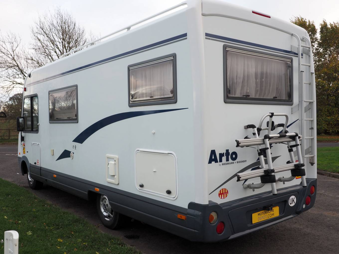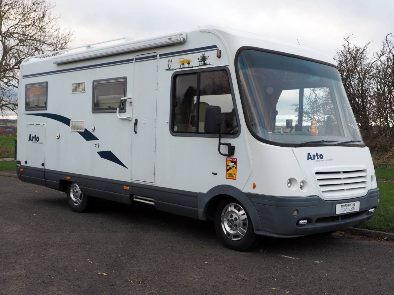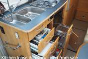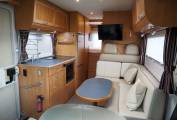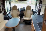 Very well equipped and solidly built 4 berth A Class motorhome, popular due to its very generous garage and sub 7 metre body length. This Arto 69G is right hand drive and comes with solar panels, Gaslow refillable bottles and bike rack, so is geared up for Europen touring. Essentially the layout comprises of a forward L lounge and swivel cab seats, side kitchen, centre washroom and wardrobe, rear double bed over the garage, plus a drop down double bed over the cab. Plated at 3850KG, drivers of the Arto will require category C1 on their licence.