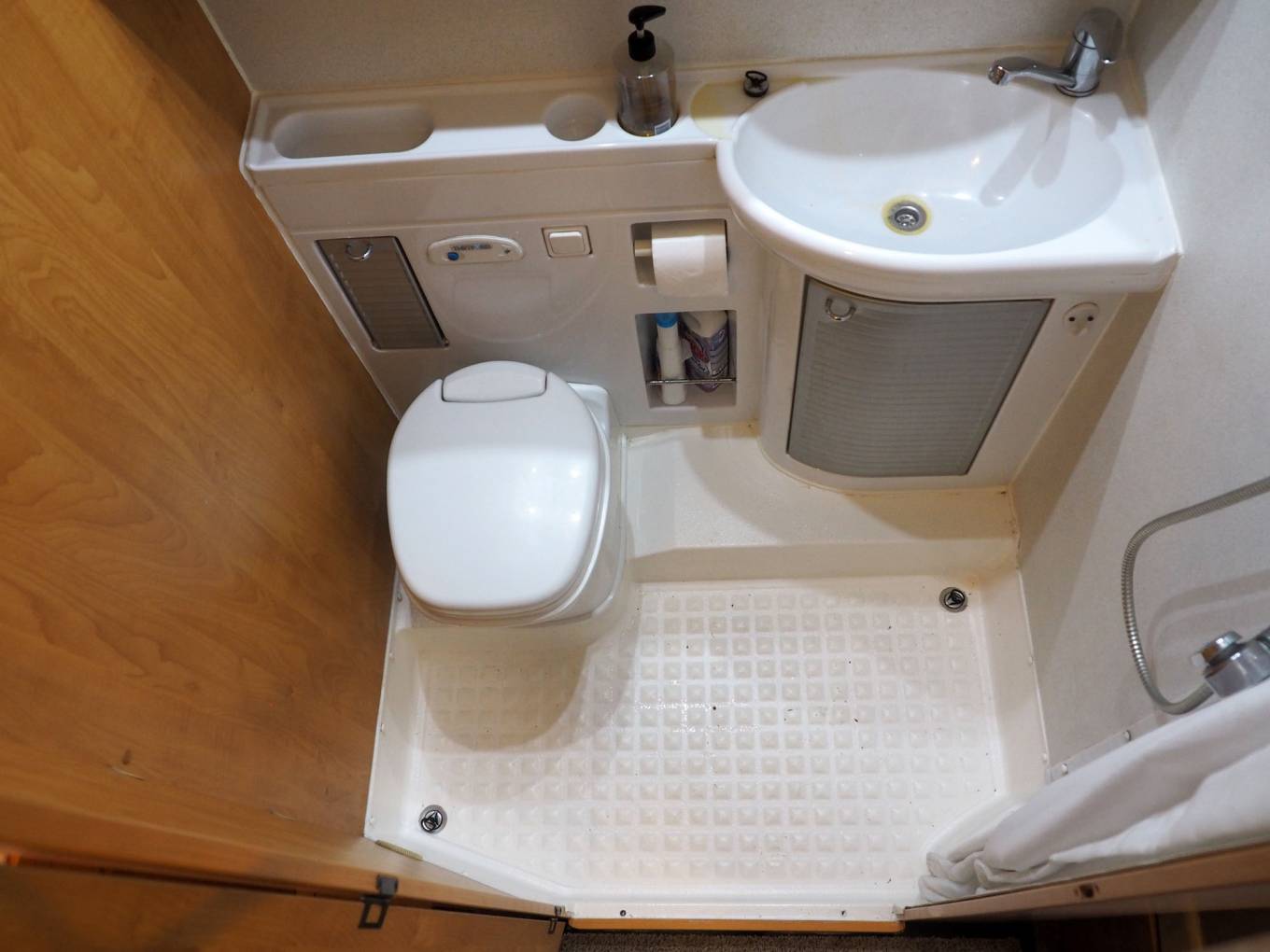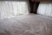 The combined washroom offers generous floor space, vanity sink, toilet and shower, opposite a large wardrobe and there is a solid privacy screen to the rear bedroom. Throughout the motorhome, there is excellent storage, both internal and external. The rear garage is particulary generous, has two access doors and and houses the spare wheel. Outside features include roll out sun canopy, twin roof mounted solar panels, quality Thule 2 bike rack, gas compartment with Gaslow refillable bottle installation.