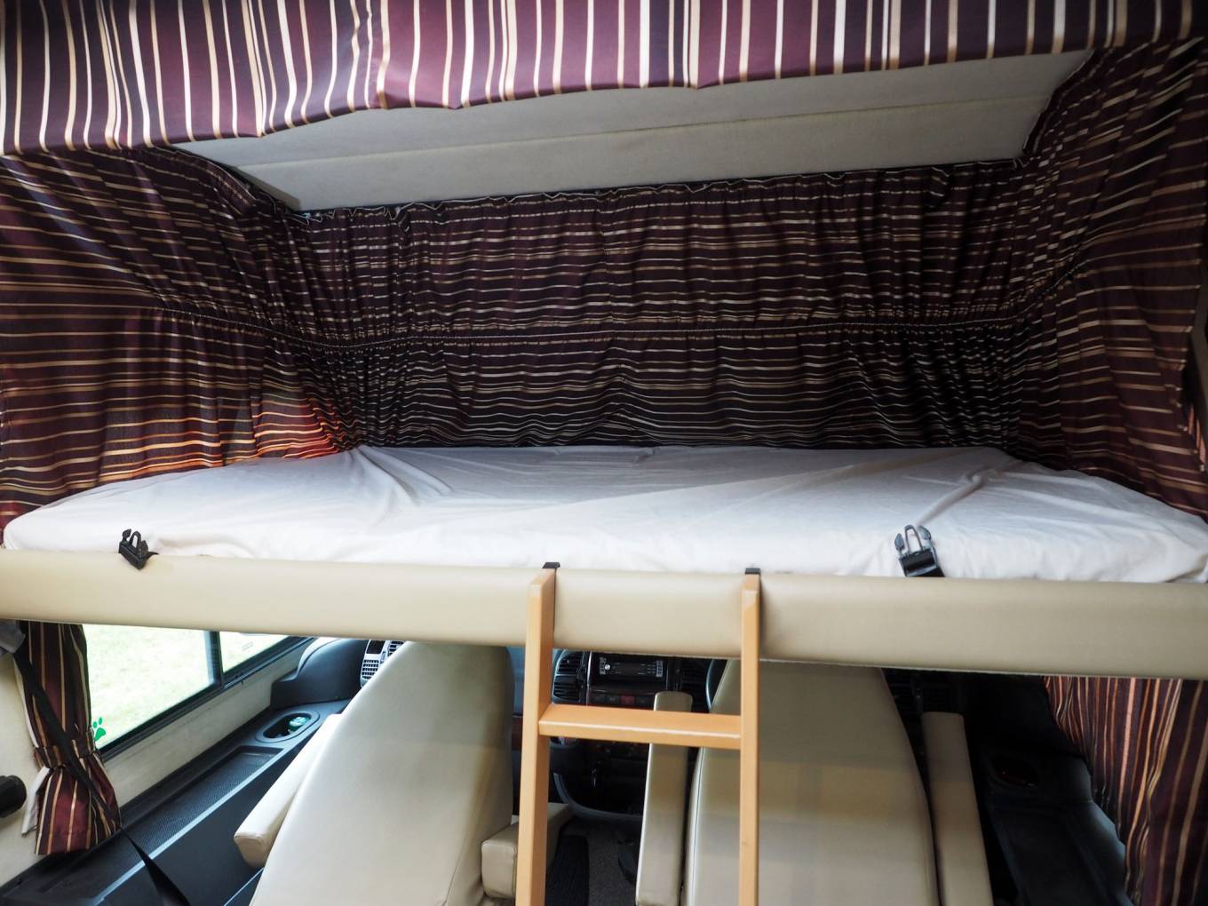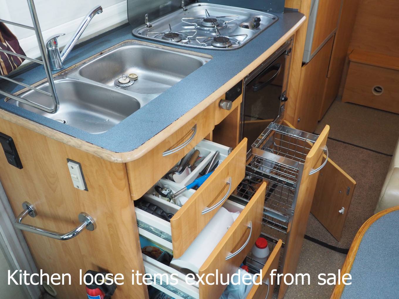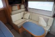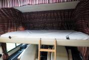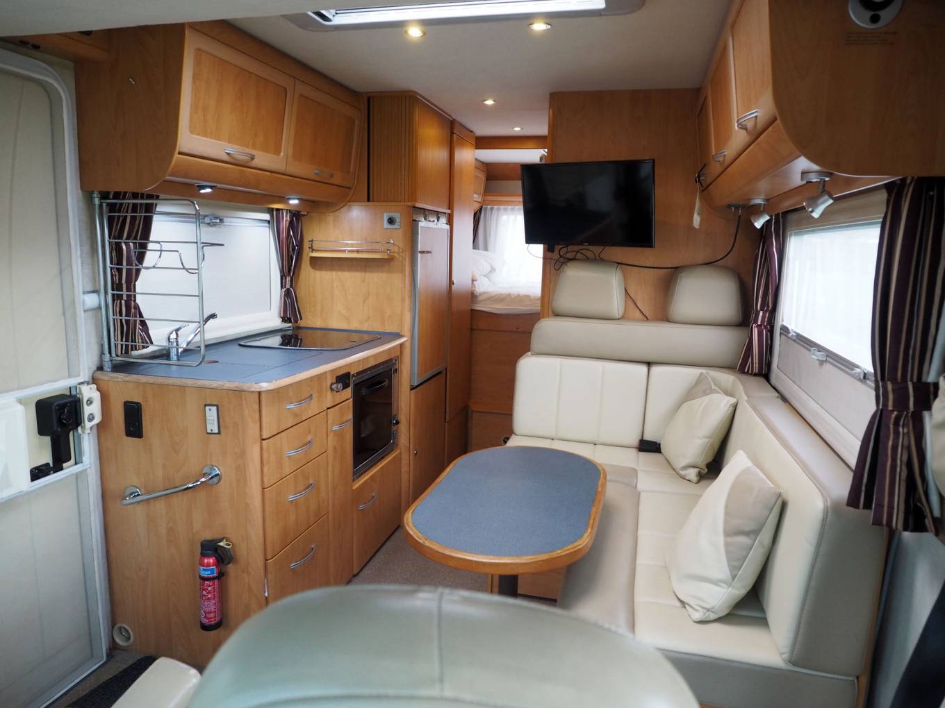Upholstery has been refinished in leather. The Aguti cab seats are very comfortable and the overcab double bed is easy to lower and raise. The cab screen has a sold privacy shutter which doubles up as a sun blind and there are curtains for screening the cab side windows. With a huge windscreen and large, easy to view mirrors, the Arto has an excellent outlook and is surprisingly easy to drive with the willing 2.8 turbodiesel engine and 5 speed gearbox. The kitchen features gas hob, oven and grill, three way fridge and oven. Kitchen lockers are secured for the road via a single turn knob. Heating and hot water are via the Truma gas powered system and water tanks are in insulated positions within the double floor.