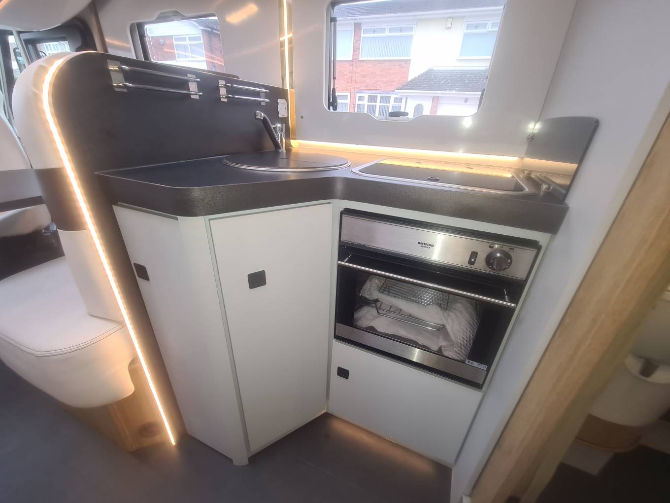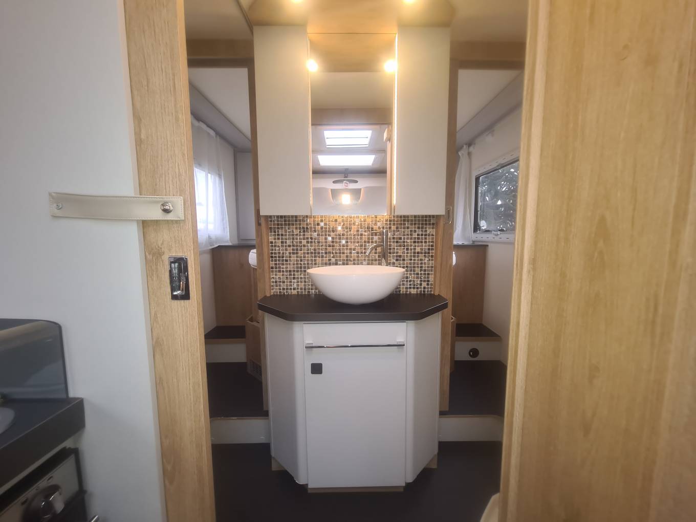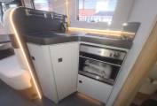 The Lounge area is Bright and Airy, courtesy of the Large Skylight above. This is a great place to relax or socialise and will comfortably seat up to five adult diners when utilising the Swivelling Captain's Seats. Above the cab is a large pull down transverse double bed.