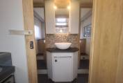 Progressing through the vehicle there is a bathroom area with a toilet on one side, a separate shower cubicle on the other, and a hand basin in the middle