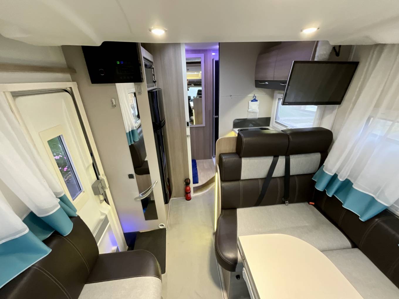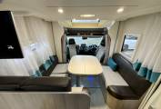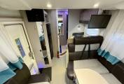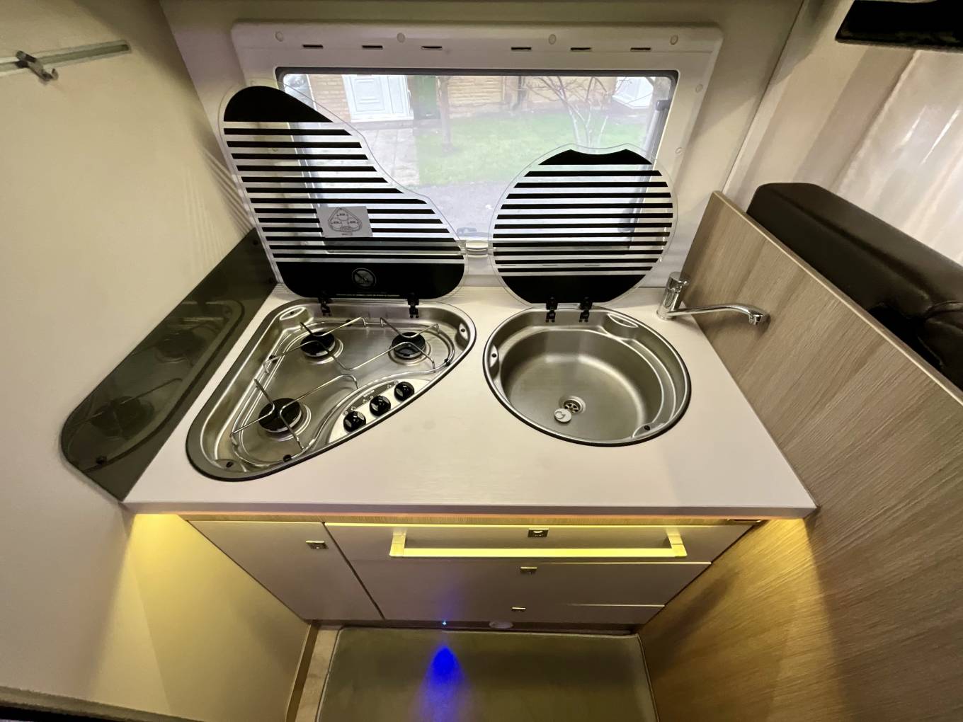 As you step into the motorhome, you enter the rear of the spacious lounge. Featuring two swivel chairs and large benches, you can easily seat seven around a stylish fold out table. LED lighting on the underside of the drop down bed illuminates the area, coupled with a large skylight above the cab. The motorhome is heated with a Truma boiler system and Webasto diesel heater.