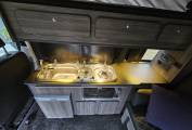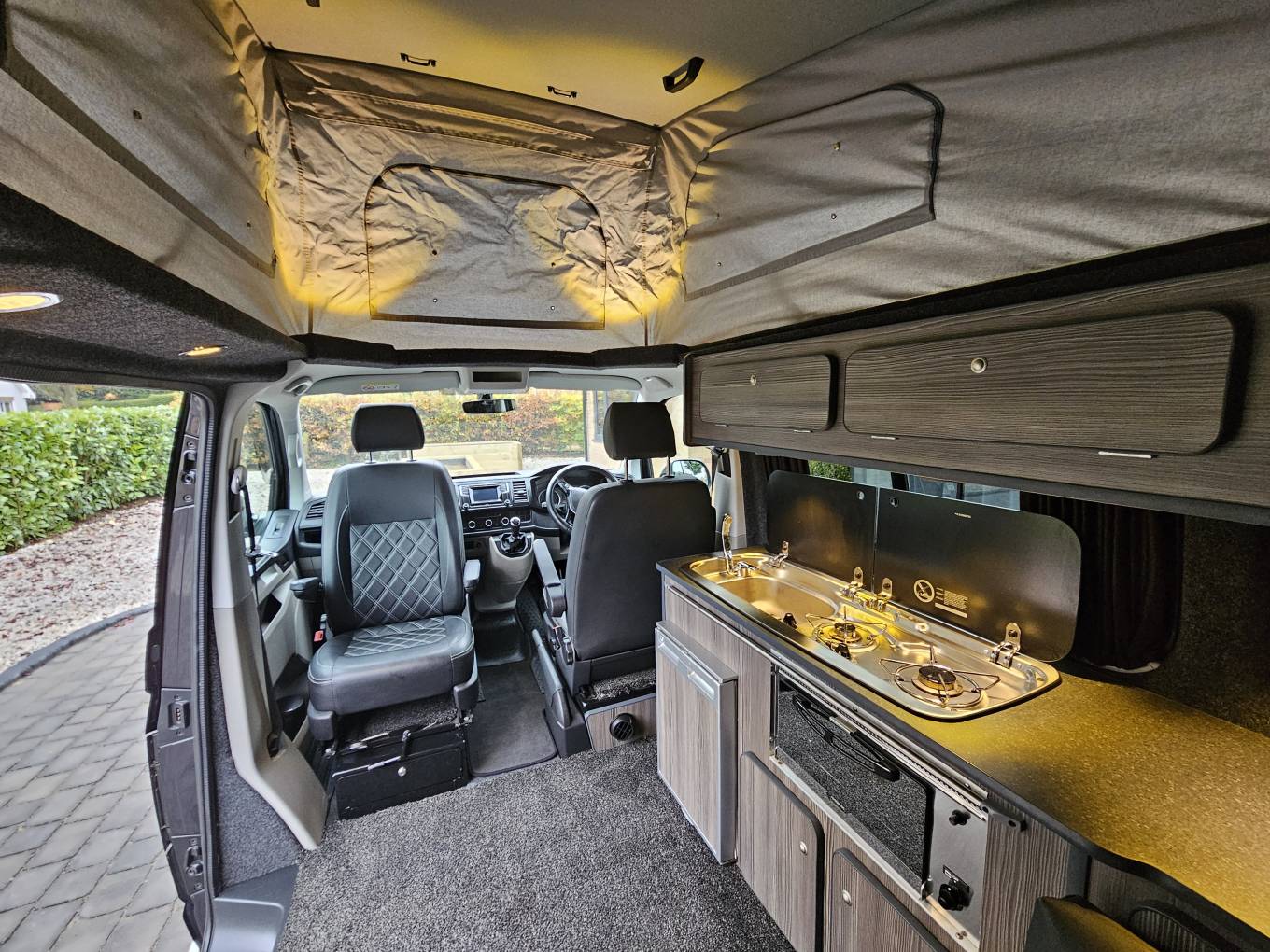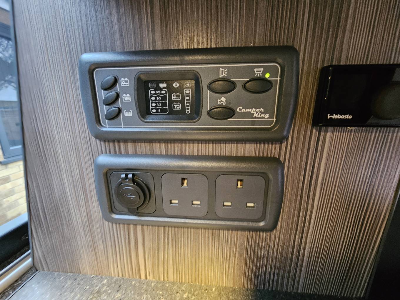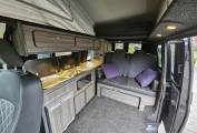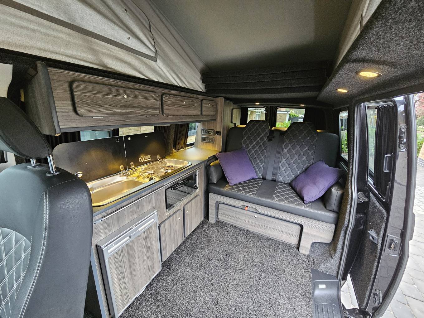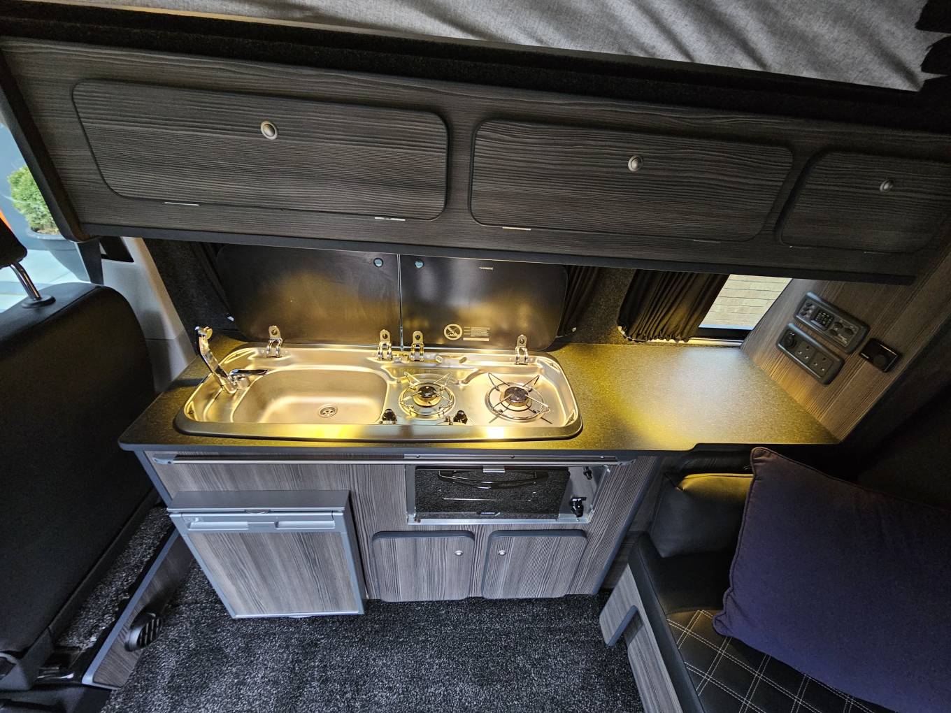 The kitchenette is fully fitted with everything you need on the go, including a fridge freezer, dual gas hob, sink, and grill. Clever storage solutions and worktop cupboards keep everything organised, while LED roof lighting adds a cosy atmosphere. A 20 litre fresh water tank with an electric pump, along with water and battery level indicators. Additional features like a Webasto heater and a solar panel allow for comfortable, off grid adventures, while an electric hook up provides an easy power source at campsites.