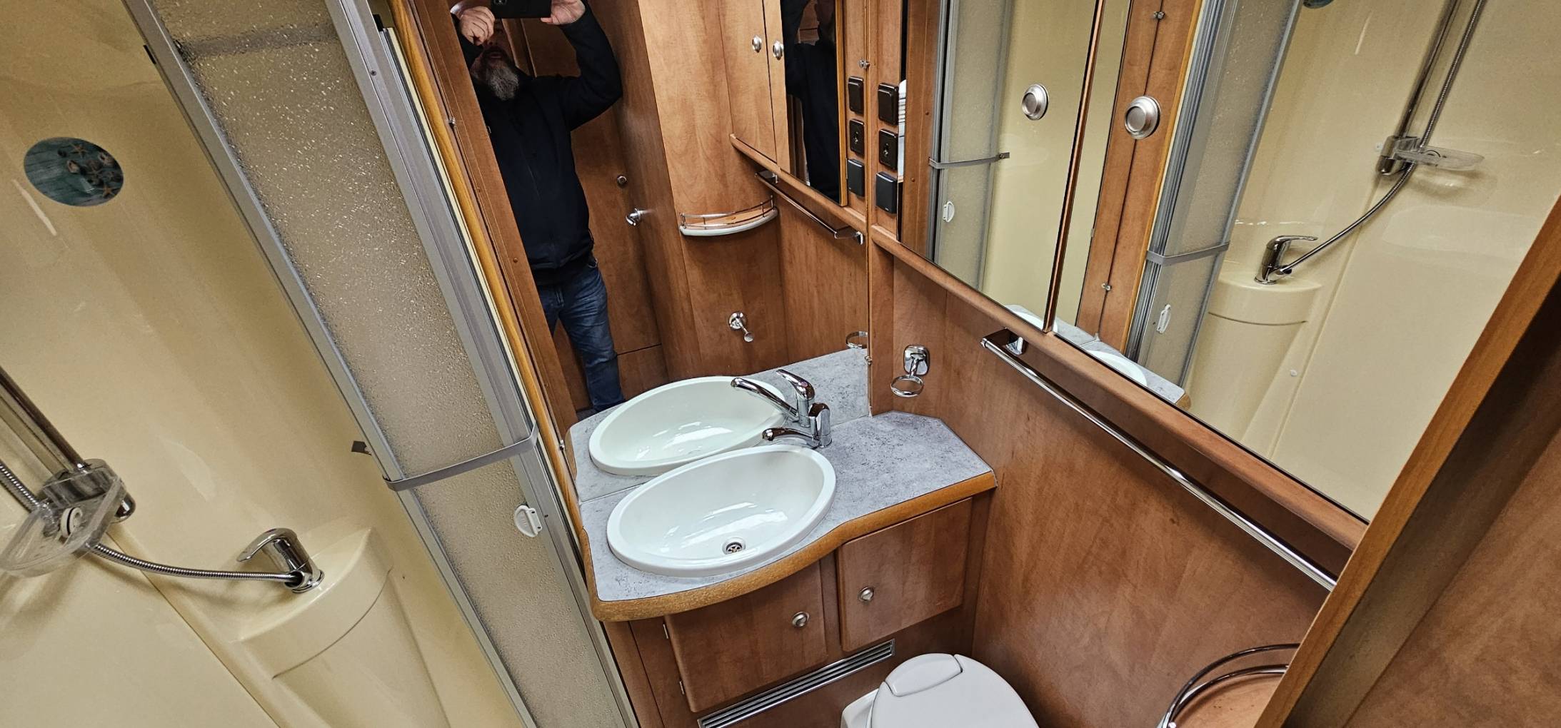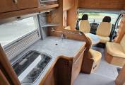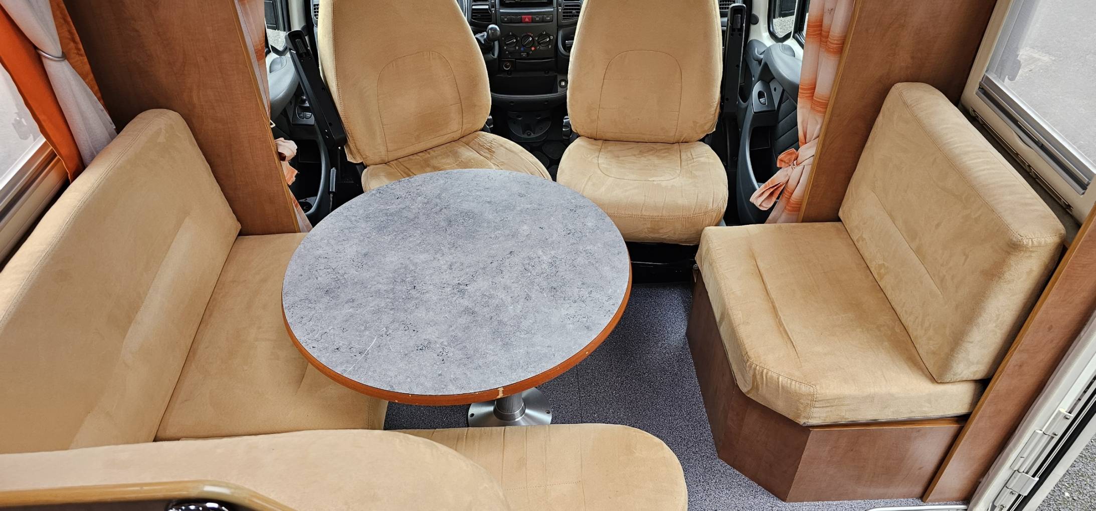 With 4 berths and belts with a sizeable garage sitting on the very reliable Fiat Ducato chassis, this is the ideal European long road trip tool that offers space and comfort whereever you are. There is a small circular dinette that seats 6 with ease and a wall mounted TV. There is a fridge/freezer and above this, a large cabinet which also houses the SOG system.