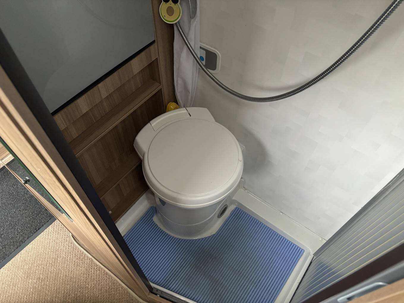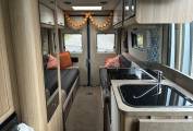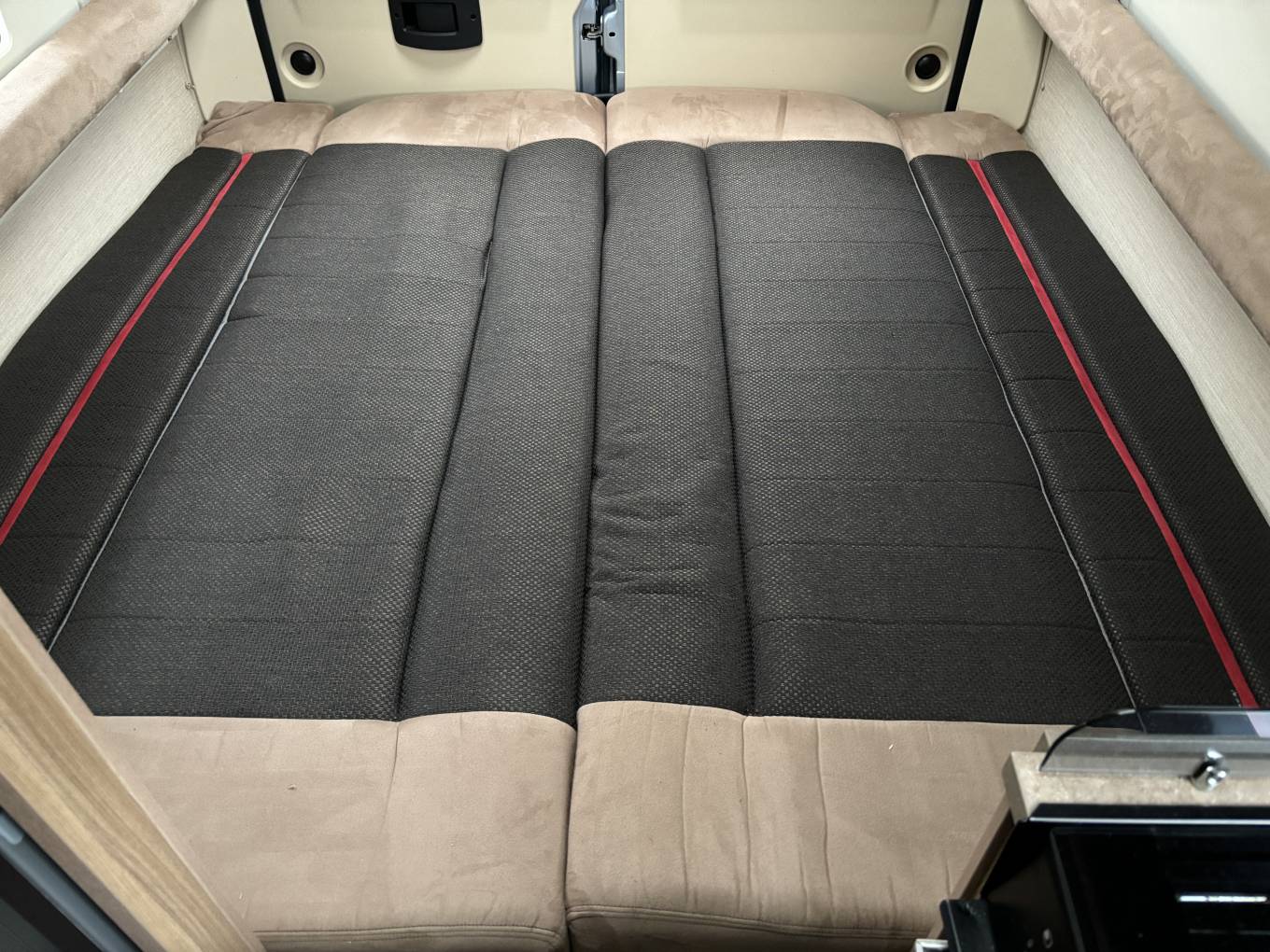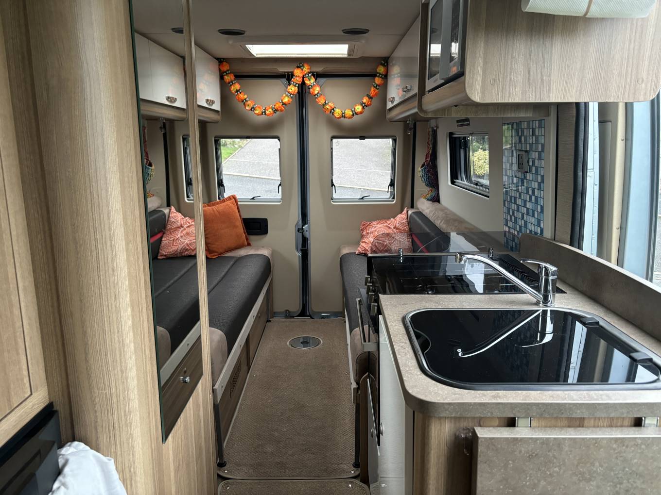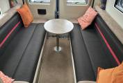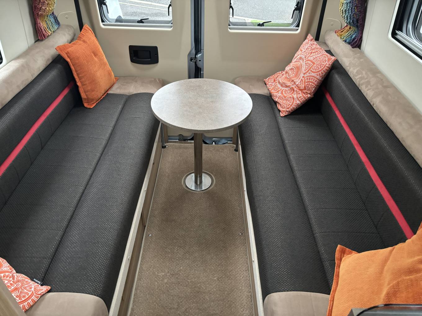 The layout provides enough space to enjoy with a lounge area at the rear consisting of two long sofas on either side of a removeable table which then converts into a large 1.88m x 1.86m double bed or two single beds. There are lots of storage lockers above, some space under the sofas and also a wardrobe so plenty of room to put your belongings.