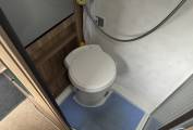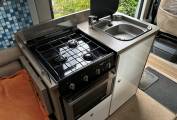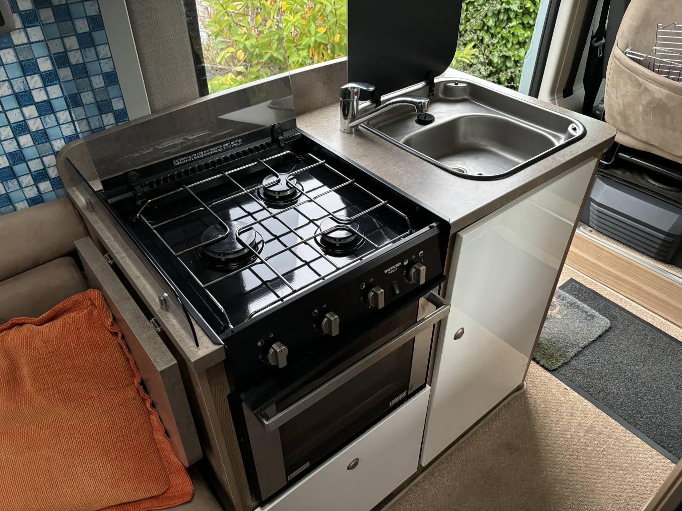In the centre there is the kitchen area which is much more well equipped than you would expect for a motorhome of this size, with a sink, oven, grill, 3 gas hobs, 3 way fridge and a microwave. The washroom opposite this also has everything you need with a toilet, shower and a neat fold out sink.