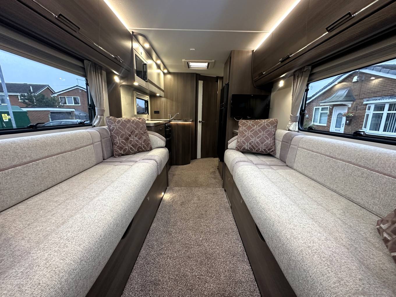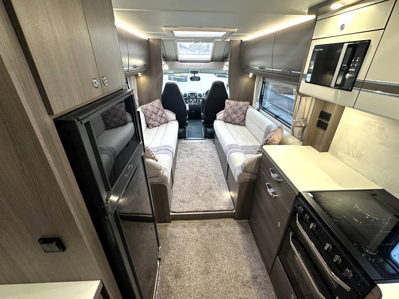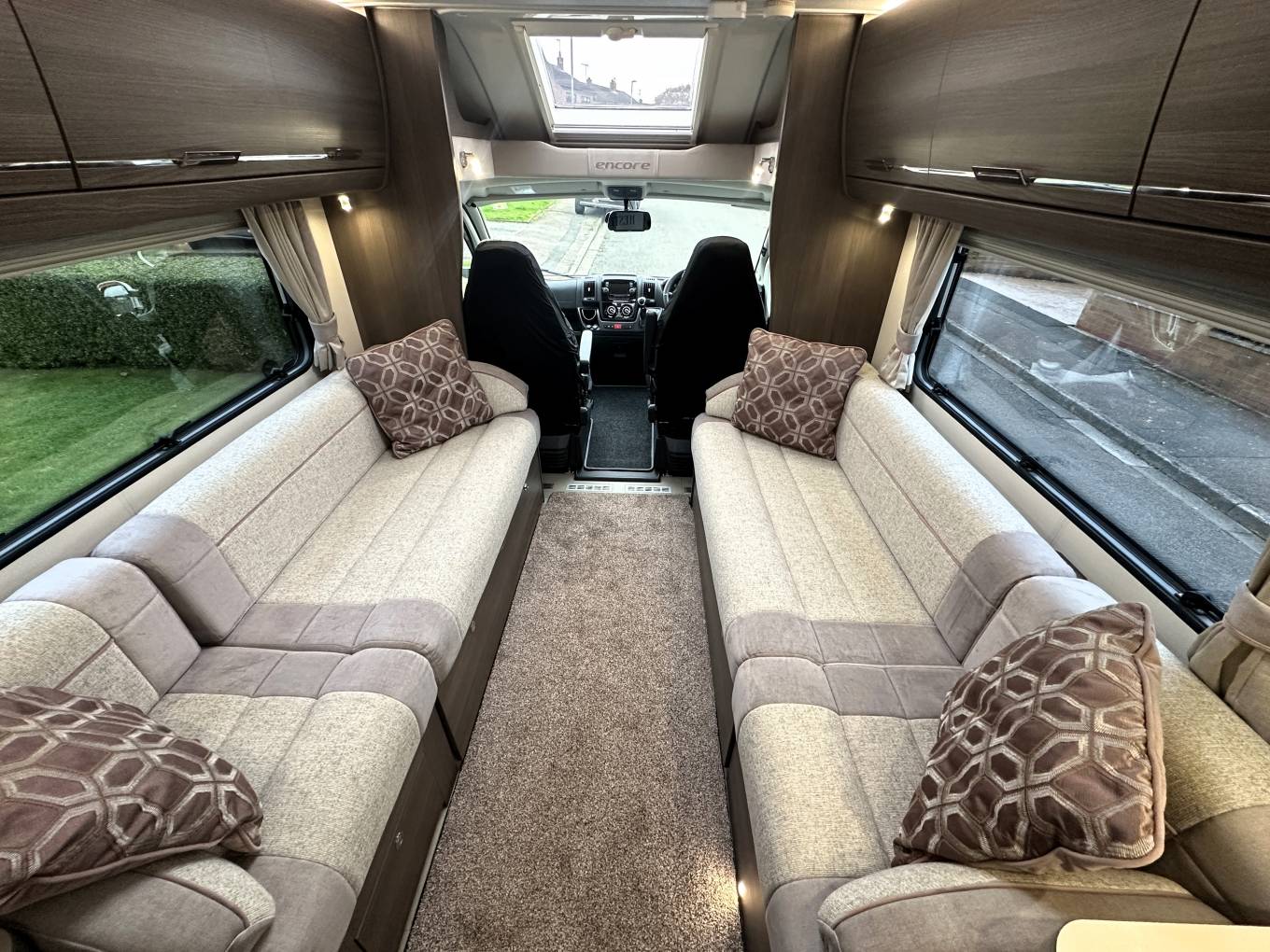 To the front of the motorhome are two long-facing sofas
