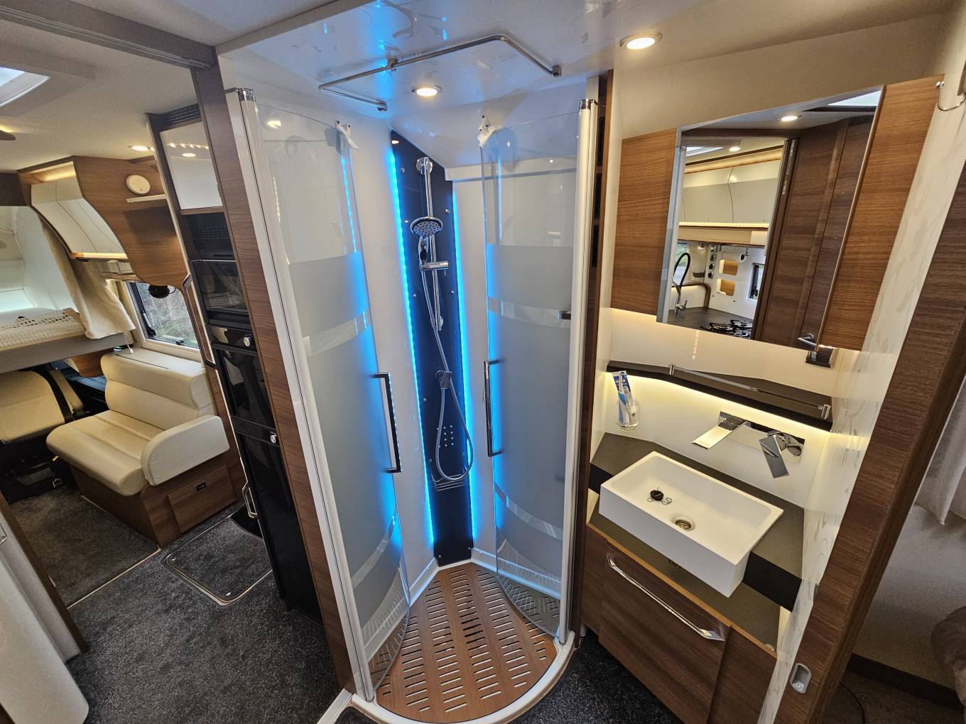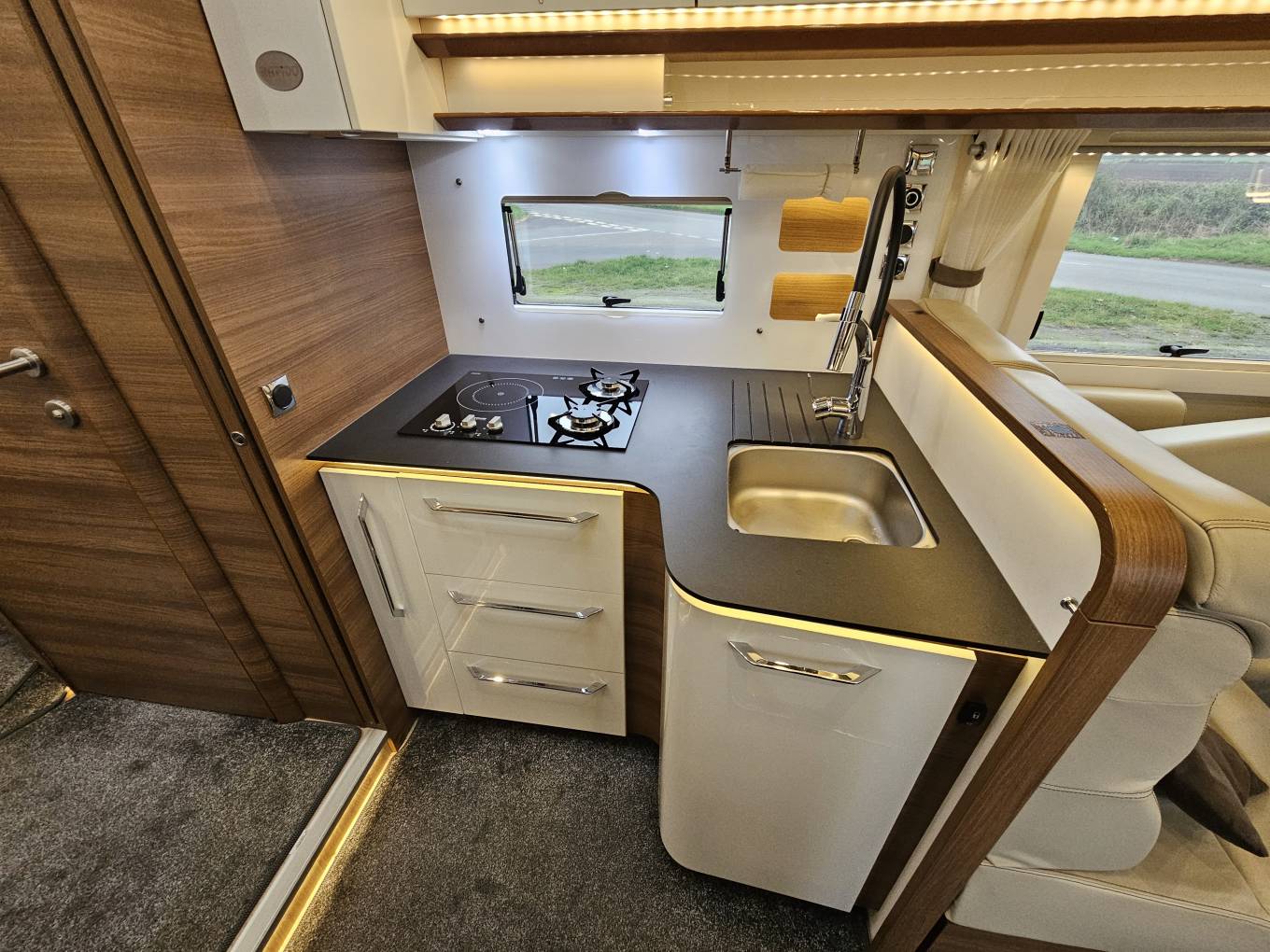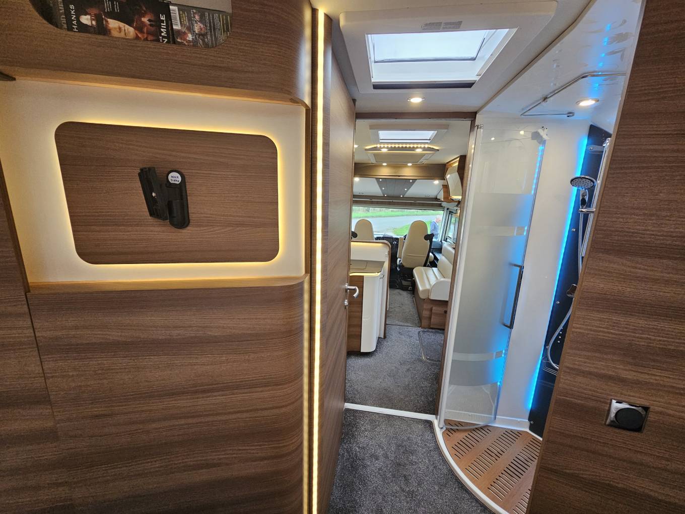 The kitchen is a standout feature, equipped with a three-burner gas hob, a built-in coffee machine for those perfect morning brews, a spacious sink with a mixer tap, and ample worktop space. LED lighting throughout adds a warm luxury and cosy feeling, the separate shower and toilet ensure all the conveniences of home are readily available and provide space and comfort.