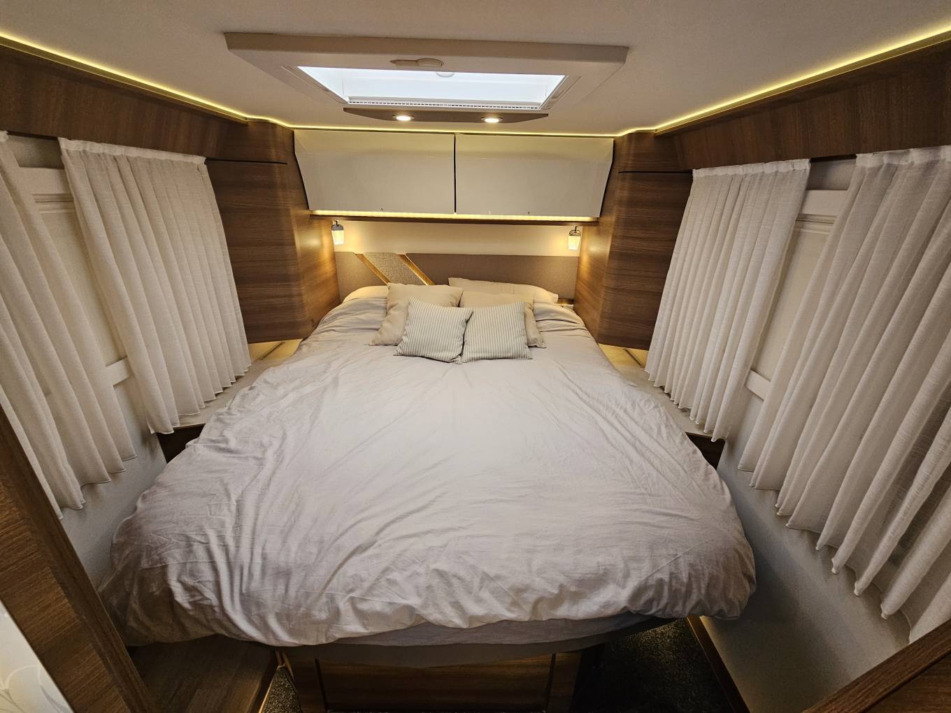 Built on the reliable Fiat Ducato platform, it features a 2.3L diesel engine paired with a smooth 9-speed automatic gearbox, offering performance. This motorhome sits at 5,000kg requiring a c1 licence to drive. This vehicle is designed for comfort, with 5 belts and 5 berth. The rear fixed island bed with adjustable headrests provides a luxurious sleeping area, while the dinette easily converts into additional sleeping space.
