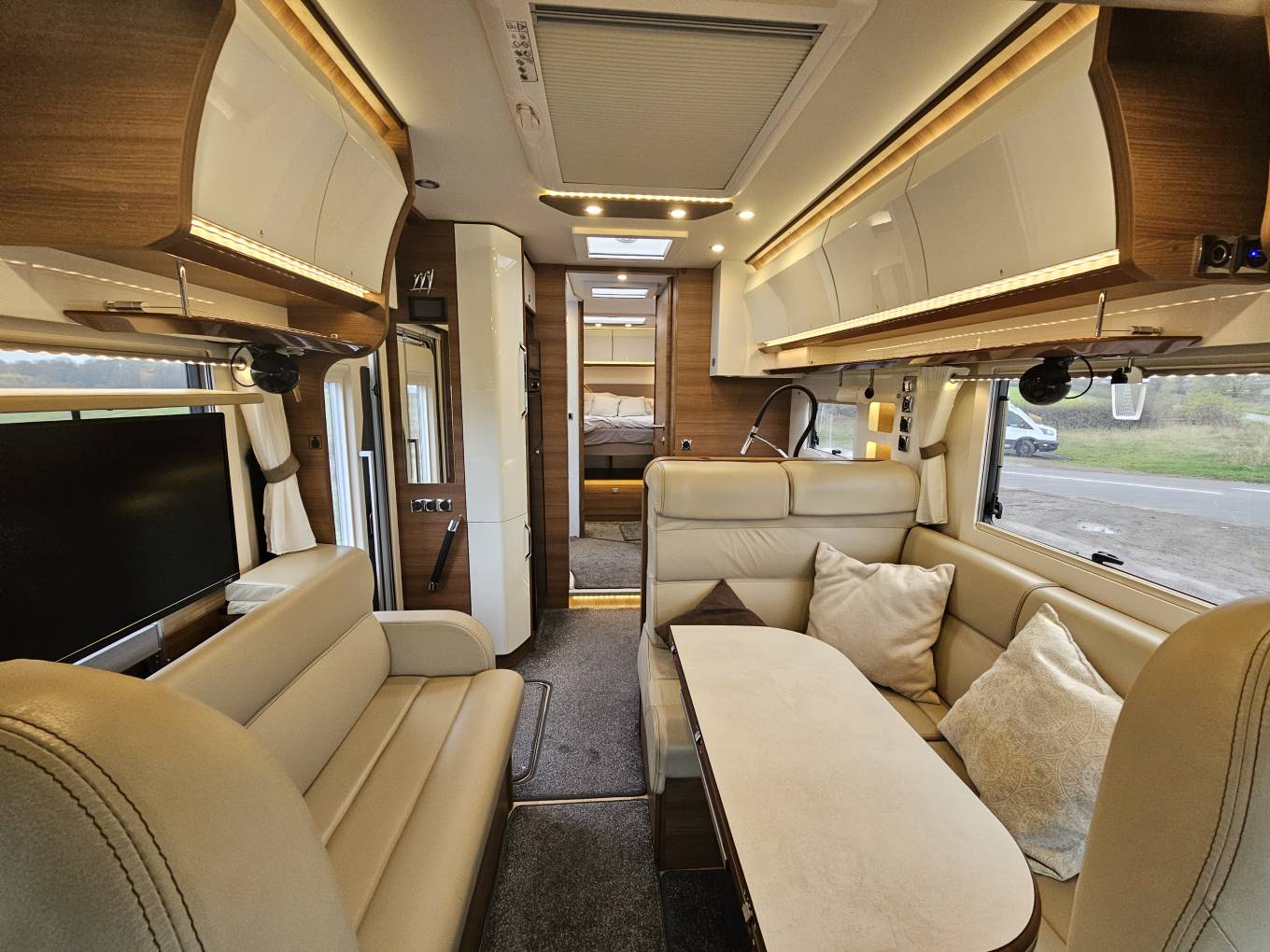 Designed for off-grid adventures, this motorhome also features two solar panels and twin lithium batteries, providing reliable power wherever you go. A Rhino self-levelling system ensures quick and hassle-free setup, and two gas bottles offer convenience for extended trips.