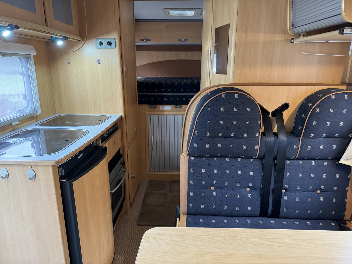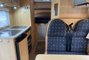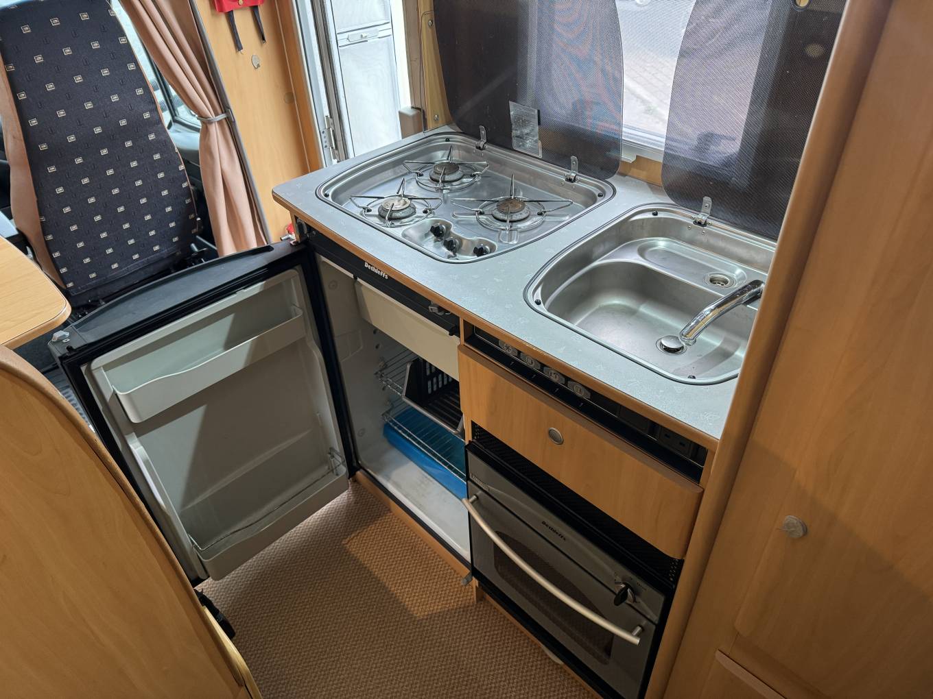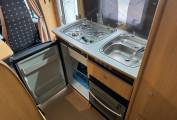 Moving through to the centre of the motorhome, we come to the kitchen area where there is a 3 ring gas hob supplied from the gas bottle located in the exterior storage unit with the Thetford oven located below along with the 3 way fridge with freezer compartment . Next to the cooker is the sink with mixer tap.