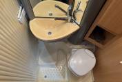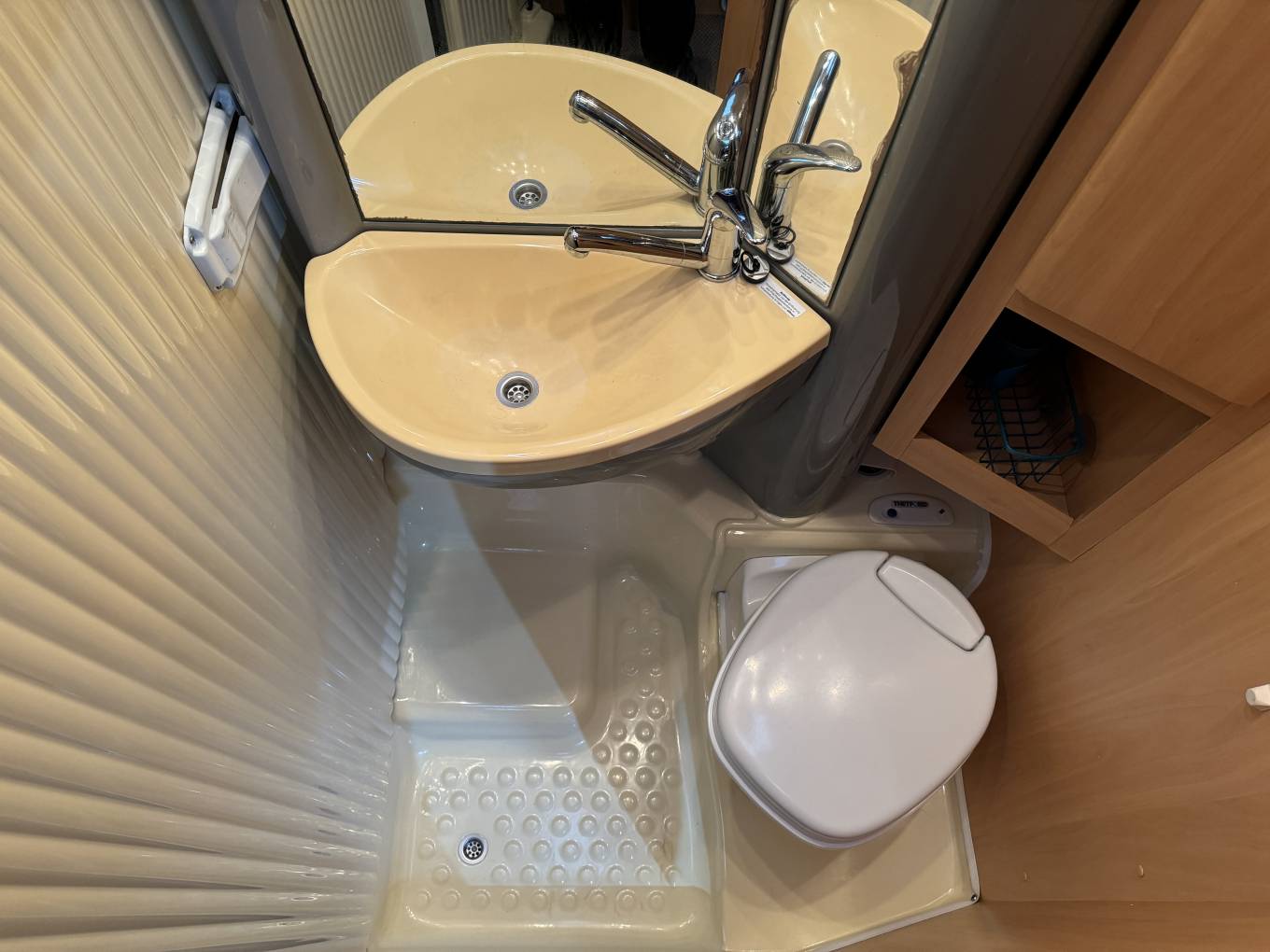 Adjacent to the kitchen is the washroom which includes a full length separate shower which is created by rotating the large sink panel as per the photos, a wash basin with mixer tap, cupboards and a separate Thetford toilet with further storage units.
